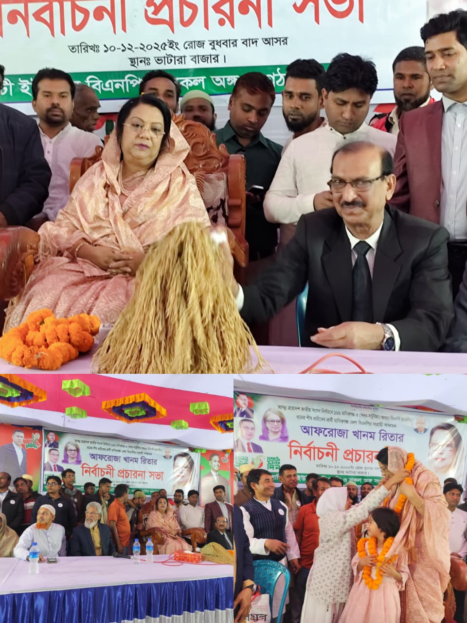 এরপর স্থানীয় মানুষের কাছ থেকে ব্যাপক দোয়া ও সমর্থন পান।ভাটারা নির্বাচনী ক্যাম্পে বিশাল জনসমাগম দুপুর পরবর্তী সময়ে তিনি উপস্থিত হন ভাটারা নির্বাচনী ক্যাম্পের প্রচারণা সভায়।সেখানে জেলা ও উপজেলা বিএনপি, যুবদল, জাসাস, ছাত্রদল, স্বেচ্ছাসেবক দল, শ্রমিক দল, কৃষক দলসহ অঙ্গ সংগঠনের শীর্ষ নেতৃবৃন্দ উপস্থিত ছিলেন।সভাস্থলে বিপুল জনসমাগম ঘটে—নারী, পুরুষ, যুবসমাজ সকলেই দলে দলে এসে রিতাকে অভ্যর্থনা জানান।তার বক্তব্যে তিনি বলেন,মানুষের অধিকার, গণতন্ত্র ও উন্নয়নের রাজনীতি পুনরুদ্ধারের জন্য ধানের শীষে আপনারা সবাই ভোট দিন। আপনাদের ভোটেই পরিবর্তন আসবে।সভায় উপস্থিত সকলেই হাত তুলে ধানের শীষে ১০০% ভোট দেয়ার প্রতিশ্রুতি ব্যক্ত করেন।দিনব্যাপী প্রচারণা জমে ওঠে নির্বাচনী আমেজে দিনশেষে আফরোজা খানম রিতার প্রচারণা সাটুরিয়া অঞ্চলে নতুন উদ্দীপনা ও প্রত্যাশা সৃষ্টি করে। সাধারণ মানুষের মুখে ছিল একটাই কথা এবার পরিবর্তন চাই, ধানের শীষেই ভোট যাবে।