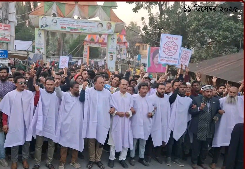 পটুয়াখালী -২ (বাউফল) আসনে বিএনপি দলীয় মনোনয়ন বাতিলের দাবিতে কাফনের কাপড় পরে বিক্ষোভ মিছিল করেছেন বিএনপির নেতা কর্মীরা।বৃহস্পতিবার (১১ ডিসেম্বর ) বিকাল ৩ ঘটিকায় সময় বাউফল পৌর শহরের পাবলিক মাঠ সংলগ্ন উপজেলা বিএনপির কার্যালয়ের সামনে সকল নেতাকর্মীরা একসাথ হয়ে এ মিছিল বের করে। মিছিলে উপজেলা, পৌর ও বিভিন্ন ইউনিয়ন বিএনপি ও সহযোগী সংগঠনের কয়েক হাজার নেতাকর্মীরা অংশ নেয়। মিছিলটি পৌর শহরের বিভিন্ন সড়ক প্রদক্ষণ করে উপজেলা পরিষদ চত্বরে গিয়ে শেষ হয় । মিছিলের নেতৃত্ব দেন উপজেলা বিএনপির আহ্বায়ক আব্দুল জব্বার মৃধা।দলীয় সূত্রে জানা যায়, গত ৪ ডিসেম্বর বিএনপি ৩৬ আসনে বিএনপি দলীয় প্রার্থীর নাম ঘোষণা করেন। পটুয়াখালী- (বাউফল) আসনে সাবেক সংসদ সদস্য শহিদুল আলম তালুকদারকে মনোনয়ন দেয়া হয়। তাকে (শহিদুল আলম) অপর দুই মনোনয়ন বঞ্চিত বিএনপি নেতা মুনির হোসেন ও একেএম ফারুক আহমেদ তালুকদারের অনুসারী মনোনয়ন প্রত্যাখানে বিক্ষুব্ধ হয়ে উঠে। এরপর থেকে লাগাতার বিক্ষোভ করছেন মনোনয়ন বঞ্চিত বিএনপি নেতা মুনির ও ফারুকের অনুসারীরা। তারা সড়ক অবরোধ,করে বিক্ষোভ মিছিল ও মশাল মিছিল করেন। আজ (বৃহস্পতিবার) কাফনের কাপড় পড়ে বিক্ষোভ সমাবেশ করেন।মিছিল শেষে সংক্ষিপ্ত সমাবেশে উপজেলা বিএনপির আহ্বায়ক ও মনোনয়ন বঞ্চিত বিএনপি নেতা মুনির হোসেনের অনুসারী আ. জব্বার মৃধা বলেন, যাকে মনোনয়ন দেয়া হয়েছে তিনি ২০০৮ সালের নির্বাচনে ধানের শীষ প্রতিকের প্রার্থীর বিরোধিতা করে আ.লীগ নেতার পক্ষে কাজ করেছেন। বিভিন্ন স্থানীয় নির্বাচনে নৌকার পক্ষে কাজ করেছেন। বিগত ১৬ বছর আন্দোলন সংগ্রামে ছিল না, দলীয় নেতা কর্মীদের পাশে ছিলেন না। আমরা তৃণমূল বিএনপি কোনো ভাবেই তাকে মেনে নিব না। আমরা এ মনোনয়ন বাতিল দাবি করছি।