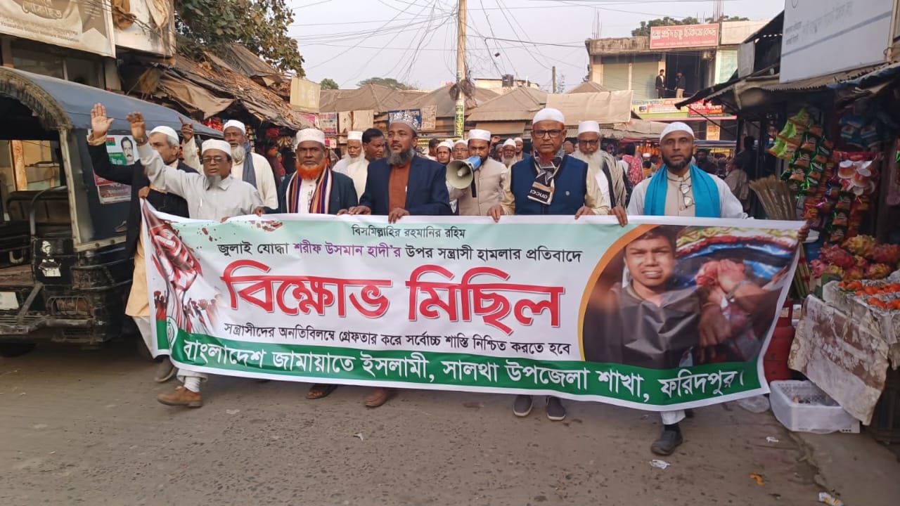 সাংস্কৃতিক সংগঠন ইনকিলাব মঞ্চের মুখপাত্র শরীফ উসমান হাদীর উপর বর্বরোচিত সন্ত্রাসী হামলার প্রতিবাদে এবং হামলাকারী সন্ত্রাসীদের অনতিবিলম্বে গ্রেফতার করে সর্বোচ্চ শাস্তি নিশ্চিত করার দাবিতে ফরিদপুরের সালথায় বিক্ষোভ মিছিল ও প্রতিবাদ সমাবেশ করেছে বাংলাদেশ জামায়াতে ইসলামী।