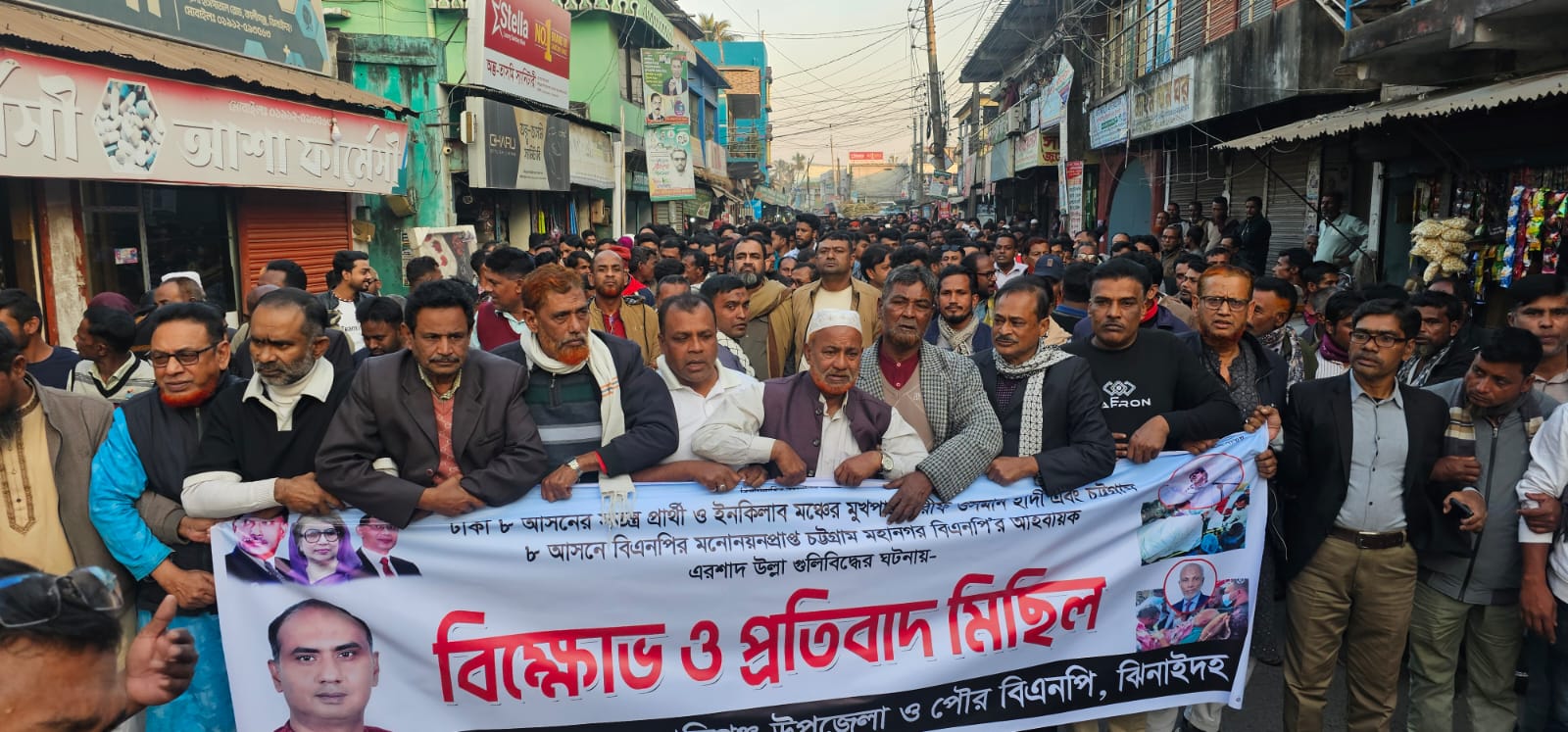 ঢাকা ৮ আসনের সতন্ত্র প্রার্থী ও ইনকিলাব মঞ্চের মুখপাত্র শরীফ ওসমান হাদী এবং চট্টগ্রাম ৮ আসনে বিএনপির মনোনয়ন প্রার্থী ও চট্টগ্রাম মহানগর বিএনপির আহবায়ক এরশাদ উল্লার গুলিবিদ্ধের ঘটনায় ঝিনাইদহ কালিগঞ্জ উপজেলা ও পৌর বিএনপির আয়োজনে বিক্ষোভ ও প্রতিবাদ মিছিল বের করে।শনিবার (১৩ ডিসেম্বর) বিকালে শহরের দলীয় কার্যালয় থেকে একটি বিক্ষোভ মিছিল বের করা হয়। মিছিলটি শহরের বিভিন্ন সড়ক ঘুরে দলীয় কার্যালয় সামনে গিয়ে শেষ হয়। পরে সেখানে সমাবেশ অনুষ্ঠিত হয় । এতে বক্তব্য রাখেন উপজেলা বিএনপির নেতা আবুল কালাম আজাদ, নজরুল ইসলাম মোল্লা, গোলাম রাব্বানী, জুমারত আলী জুম্মা , আবু জাফর, বাবলু আক্তার, সোহরাব হোসেন রাজু, মুন্সি কামরুল ইসলাম, মাজহারুল ইসলাম প্রিন্স, শাহজাহান আলী খোকন, জাহাঙ্গীর হোসেন সহ বিএনপি যুবদল ছাত্রদল স্বেচ্ছাসেবক দল সহ সকল অঙ্গ ও সহযোগী সংগঠনের নেতৃবৃন্দৎউপস্থিত ছিলেন ।এ সময় বক্তারা বলেন,ঢাকা ৮ আসনের স্বতন্ত্র সংসদ সদস্য প্রার্থী ও ইনকিলাব মঞ্চের মুখপাত্র শরীফ ওসমান হাদী ও চট্টগ্রাম ৮ আসনের সংসদ সদস্য প্রার্থী ও চট্টগ্রাম মহানগর বিএনপি'র আহবায়ক এরশাদ উল্লার উপর যারা নেক্কারজনক এই হামলা চালিয়েছে তাদেরকে দ্রুত গ্রেফতার করে শাস্তির মুখোমুখি করা হোক ।