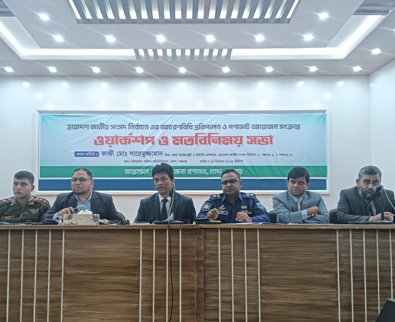 বাংলাদেশের এক নম্বর জেলা হিসেবে ত্রয়োদশ জাতীয় নির্বাচনে মডেল নির্বাচন অনুষ্ঠিত হবে বলে মন্তব্য করেছেন, পঞ্চগড় জেলা প্রশাসক কাজী মো: সায়েমুজ্জামান।শনিবার (১৩ ডিসেম্বর) পঞ্চগড়ের বোদা উপজেলা প্রশাসনের আয়োজনে ত্রয়োদশ জাতীয় নির্বাচনে আচরণবিধি প্রতিপালন ও গণভোট আয়োজন সংক্রান্ত ওয়ার্কশপ এবং মতবিনিময় সভায় প্রধান অতিথির বক্তব্যে তিনি এ কথা বলেন। জেলা প্রশাসক বলেন।আপনারা এই কর্মশালার মাধ্যমে আচরণবিধি জেনে গেলেন। বিশেষ করে সামজিক যোগাযোগ মাধ্যম অনলাইনে কেউ যেন অপতথ্য না ছড়ায় সেজন্য প্রার্থীরা নিজ নিজ দলের কর্মীদের সচেতন করবেন। প্রতিদ্বন্দ্বী সকল দলের সহযোগিতায় পঞ্চগড় জেলায় একটি অবাধ সুষ্ঠু, নিরপেক্ষ নির্বাচন করতে পারি সেজন্য দুই আসনের প্রার্থীদের একই মঞ্চে নিয়ে স্ব স্ব প্রার্থীর ইশতেহার ঘোষণার ব্যবস্থা করবো। আচরণবিধি লঙ্ঘনের জন্য কোন দলের সাথে পক্ষপাতমূলক আচরণ করা হবের না। ইতিমধ্যে প্রতি উপজেলায় দুইজন করে ম্যাজিস্ট্রেট নিয়োগ করা হয়েছে। আচরণ বিধি লঙ্ঘন হলে জেলা প্রশাসনের পক্ষ থেকে কঠোর আইনি ব্যবস্থা গ্রহণ করা হবে। তিনি আরও বলেন, ৫ই আগস্টের পর সকল দলের প্রত্যাশা অনুযায়ী একটি সুষ্ঠু অবাধ ও নিরপেক্ষ নির্বাচন আয়োজনে আমরা বদ্ধ পরিকর আপনারা ঐক্যবদ্ধ থাকুন যাতে কোন দুষ্কৃতকারী নির্বাচন বাধাগ্রস্ত করতে না পারে।