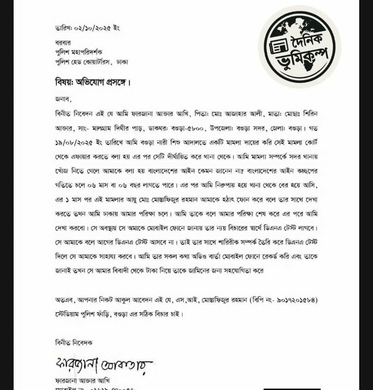 বগুড়া সদরের ফারজানা আক্তারের স্বামী মোঃ আলআমিন আলী (ঠিকানা: মধুপুর, বগুড়া সদর) পুলিশ হেডকোয়ার্টার্সে পাঠানো এক আবেদনে গুরুতর অভিযোগ তুলেছেন। তিনি জানিয়েছেন, গত ১৯/০২/২০২৫ তারিখে শ্বশুরবাড়ির এক নারী তাঁর বিরুদ্ধে মিথ্যা মামলা দায়ের করলে তিনি আদালত থেকে জামিন নেন। এর পরপরই মামলার সরেজমিন তদন্তে কিছু কর্মকর্তার বিরুদ্ধে নথি ‘ম্যানেজ’ করার প্রস্তাব এবং হুমকির অভিযোগ করেন তিনি।লিখিত অভিযোগে আলআমিন আলী উল্লেখ করেন, মামলার তদন্ত কর্মকর্তা মোজাহিদুল রহমান তাঁর সঙ্গে যোগাযোগ করে মামলার নথি নিজেদের মতো করে চালানোর ইঙ্গিত দেন। তিনি না রাজি হওয়ায় একপর্যায়ে তাকে থানায় ডেকে এনে মোবাইলে বিভিন্ন ভিডিও দেখিয়ে ভয়ভীতি প্রদর্শনের চেষ্টা করা হয়। অভিযোগে আরও বলা হয়, পরবর্তীতে তাঁকে ডিজিটাল জালিয়াতির মাধ্যমে ফাঁসানো হতে পারে বলে হুমকি দেয়া হয়।আবেদনকারী দাবি করেন, শান্তিপূর্ণ সমাধানের প্রলোভন দেখিয়ে ডিজিটাল টেক্সট মেসেজের মাধ্যমে যোগাযোগের চেষ্টা করা হয় এবং অভিযোগ ‘তুলে নেওয়ার’ বিনিময়ে আর্থিক লেনদেনের কথাও শোনানো হয়। তিনি এ ঘটনাকে প্রতারণা ও ক্ষমতার অপব্যবহার বলে উল্লেখ করেন।ঘটনার সঠিক তদন্ত ও ন্যায়বিচারের স্বার্থে তিনি ডিআইজি, এসআই, এবং তদন্ত কর্মকর্তা মোজাহিদুল রহমানসহ সংশ্লিষ্টদের বিরুদ্ধে যথাযথ departmental তদন্তের আবেদন জানিয়েছেন।আবেদনপত্রটি ফারজানা আক্তার আনি স্বাক্ষরিত এবং বিষয়টিতে দ্রুত আইনগত ব্যবস্থা নেওয়ার দাবি পুনর্ব্যক্ত করা হয়েছে।