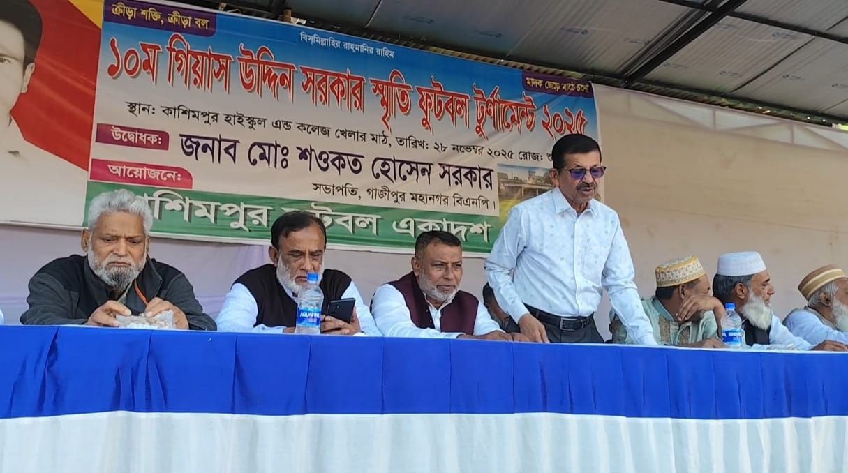গাজীপুর জেলার কাশিমপুর হাই স্কুল ও কলেজ মাঠে উৎসবমুখর পরিবেশে অনুষ্ঠিত হয়েছে ১০ম গিয়াস উদ্দিন সরকার স্মৃতি ফুটবল প্রতিযোগিতা ২০২৫। স্থানীয় ক্রীড়াপ্রেমী দর্শকদের উপস্থিতিতে দিনব্যাপী এ টুর্নামেন্টে ছিল টানটান উত্তেজনা ও প্রাণবন্ত প্রতিদ্বন্দ্বিতা।খেলায় উদ্ভোদক ছিলেন মোঃ শওকত হোসেন সরকার সভাপতি, গাজীপুর মহানগর বিএনপি।প্রতিযোগিতার গুরুত্বপূর্ণ ম্যাচে মুখোমুখি হয় প্যারাডাইস এফ সি ও বি কে এসপিয়ান। নির্ধারিত সময়ের খেলায় উভয় দলই সমানতালে আক্রমণ ও রক্ষণভাগে দৃঢ়তা প্রদর্শন করে। নির্ধারিত সময় শেষে ম্যাচটি ১-১ গোলে অমীমাংসিত থাকায় খেলাটি ট্রাইবেকারে গড়ায়।ট্রাইবেকারে চরম উত্তেজনার মধ্য দিয়ে বি কে এসপিয়ান দল তাদের নৈপুণ্য ও দৃঢ় মানসিকতার পরিচয় দিয়ে প্যারাডাইস এফ সি-কে পরাজিত করে। এই জয়ের মাধ্যমে বি কে এসপিয়ান দল সেমিফাইনাল খেলার যোগ্যতা অর্জন করে।খেলা শেষে আয়োজক কমিটির পক্ষ থেকে বিজয়ী দলকে অভিনন্দন জানানো হয় এবং পরাজিত দলকেও তাদের সাহসী খেলায় প্রশংসা করা হয়। আয়োজকরা জানান, গিয়াস উদ্দিন সরকারের স্মৃতিকে সম্মান জানাতে এবং তরুণদের খেলাধুলার প্রতি আগ্রহ বাড়াতে প্রতিবছর এ ধরনের আয়োজন অব্যাহত থাকবে।উল্লেখ্য, এ প্রতিযোগিতা স্থানীয় ক্রীড়াঙ্গনে ব্যাপক উৎসাহ-উদ্দীপনার সৃষ্টি করেছে এবং আগামী দিনের খেলাগুলোকে ঘিরে দর্শকদের মধ্যে বাড়তি আগ্রহ লক্ষ্য করা যাচ্ছে।