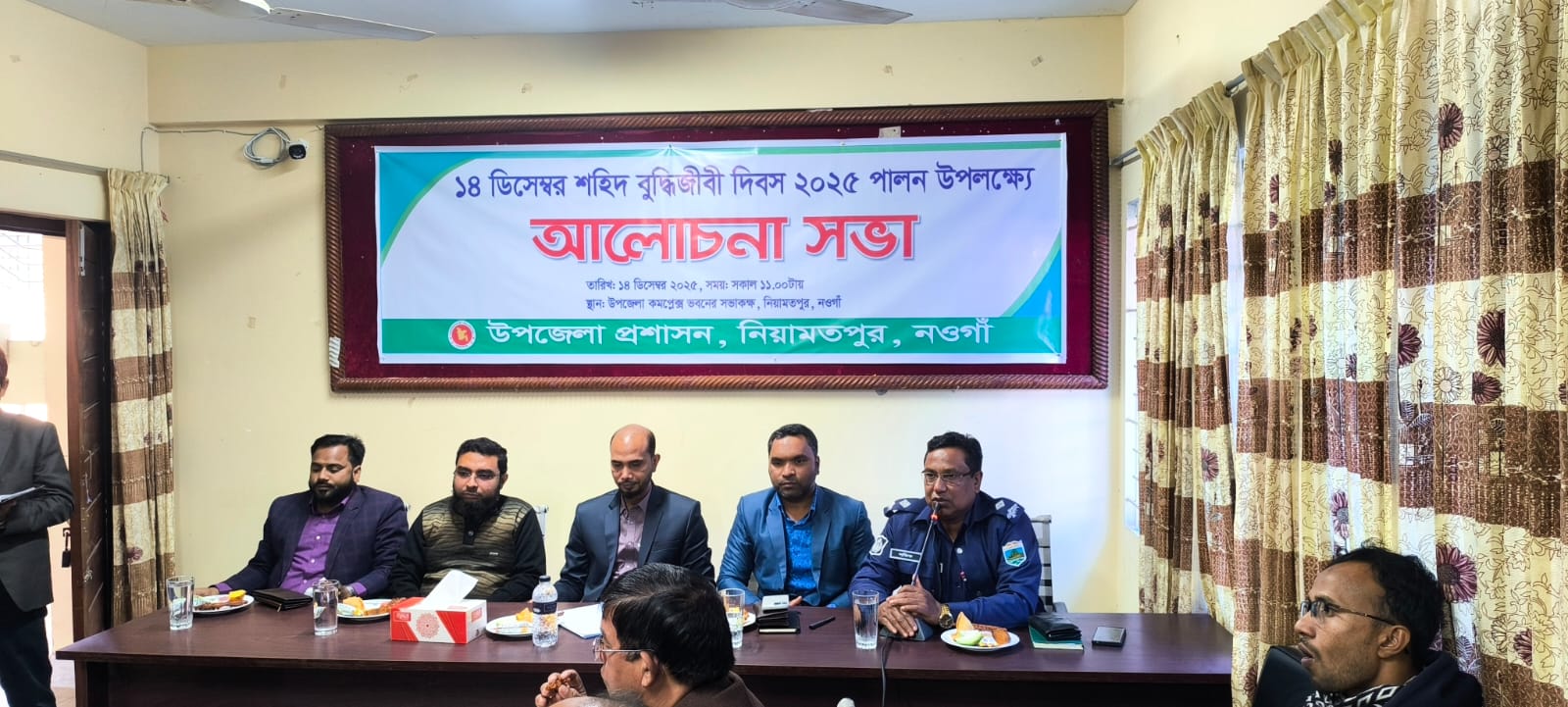 আজ ১৪ ডিসেম্বর রোজ রবিবার শহিদ বুদ্ধিজীবী দিবস উপলক্ষে উপজেলা প্রশাসনের আয়োজনে উপজেলা নির্বাহী অফিসার এর সভা কক্ষে আলোচনা সভা অনুষ্ঠিত হয়েছে । উপজেলা সহকারী কমিশনার ভূমি রেজাউল করিম এর সভাপতিত্বে অনুষ্ঠানটি অনুষ্ঠিত হয়। অনুষ্ঠানে উপস্থিত ছিলেন উপজেলা কৃষি অফিসার রফিকুল ইসলাম, নিয়ামতপুর থানা অফিসার ইনচার্জ শফিকুল ইসলাম, উপজেলা মেডিকেল এর প্রধান ফয়সাল নাহিদ পবিত্র, প্রাণিসম্পদ কর্মকর্তা আব্দুল্লাহ আল মামুন, নিয়ামতপুর উপজেলা মডেল প্রেসক্লাব ও বাংলাদেশ মফস্বল সাংবাদিক ইউনিয়ন নিয়ামতপুর শাখার সভাপতি মোঃ আব্দুল আজিজ শেখ, সাংবাদিক করিম পারভেজ।
