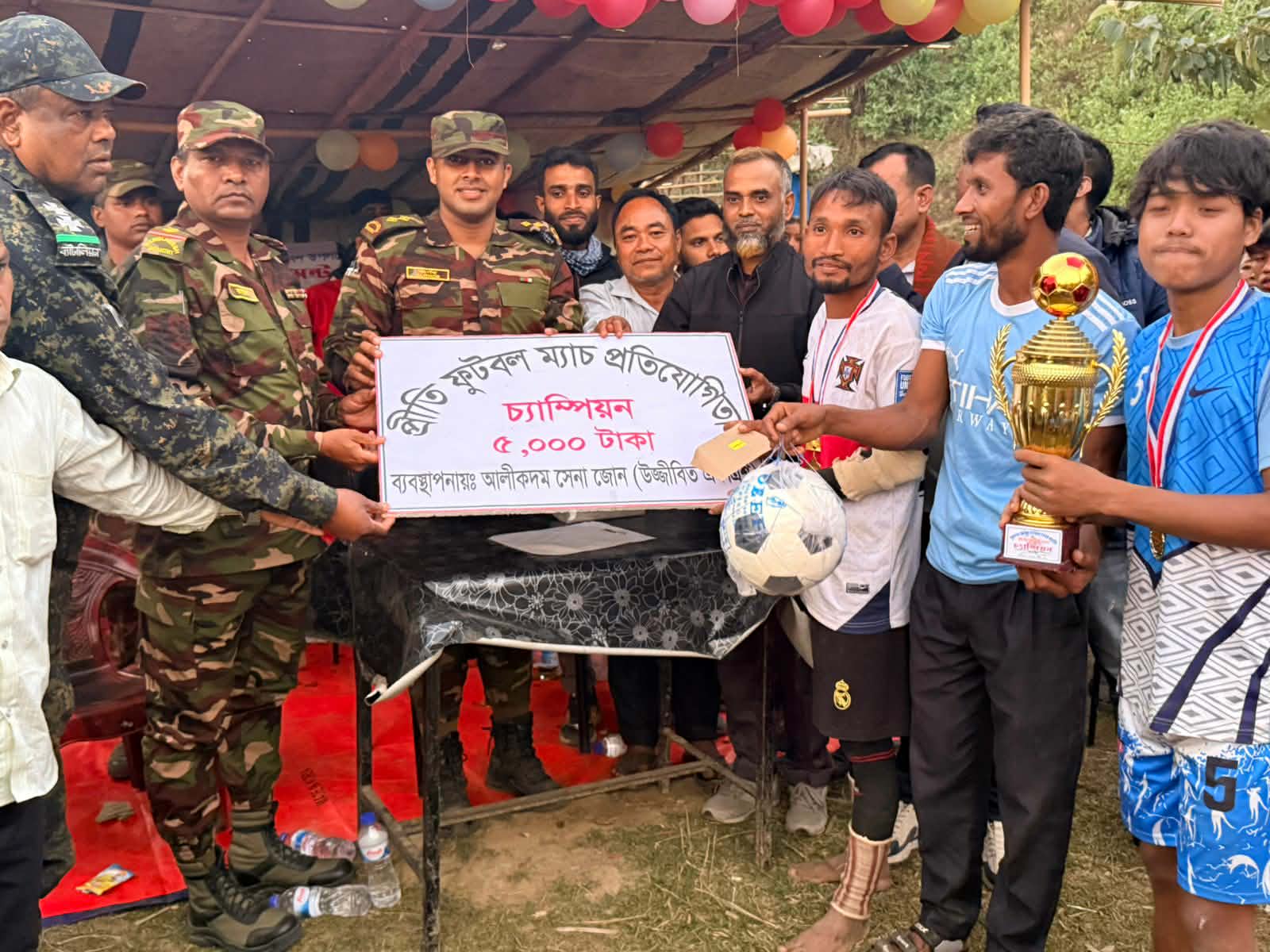 আলীকদম সেনা জোনের পৃষ্ঠপোষকতায় উৎসবমুখর পরিবেশে সম্পন্ন ফুটবল টুর্নামেন্ট–২০২৫ কুরুকপাতা বৌদ্ধ বিহার উদ্বোধন উপলক্ষে আয়োজিত ফুটবল টুর্নামেন্ট–২০২৫ অত্যন্ত সুশৃঙ্খল, শান্তিপূর্ণ ও উৎসবমুখর পরিবেশে সফলভাবে সম্পন্ন হয়েছে। স্থানীয় জনগণের স্বতঃস্ফূর্ত অংশগ্রহণে আয়োজিত এই টুর্নামেন্ট সামাজিক সম্প্রীতি ও সৌহার্দ্য বৃদ্ধিতে গুরুত্বপূর্ণ ভূমিকা রাখে।গত ২৩ নভেম্বর ২০২৫ তারিখে কুরুকপাতা বাজার এলাকায় টুর্নামেন্টটির শুভ সূচনা হয়। এতে বিভিন্ন এলাকা থেকে আগত মোট ১৪টি দল অংশগ্রহণ করে। সার্বিক ব্যবস্থাপনা আরও সুসংগঠিত ও শৃঙ্খলাপূর্ণ করতে পরবর্তীতে টুর্নামেন্টটি আলীকদম সেনা জোনের অধীনস্থ মেনদপাড়া আর্মি ক্যাম্পের তত্ত্বাবধানে পরিচালিত হয়।রোমাঞ্চকর ফাইনাল খেলায় কুরুকপাতা যুব একাদশ চ্যাম্পিয়ন হওয়ার গৌরব অর্জন করে। অপরদিকে কালিয়ারছড়া একাদশ রানারআপ হিসেবে নির্বাচিত হয়। টুর্নামেন্ট শেষে বিভিন্ন ক্যাটাগরিতে শ্রেষ্ঠ খেলোয়াড়দের পুরস্কৃত করা হয় এবং সফল আয়োজনের জন্য আয়োজক কমিটির সদস্যদের সম্মাননা প্রদান করা হয়।পুরস্কার বিতরণ অনুষ্ঠানে প্রধান অতিথি হিসেবে উপস্থিত ছিলেন মেনদপাড়া আর্মি ক্যাম্প কমান্ডার লেফটেন্যান্ট মোহাম্মদ মুবতাসিম ফুয়াদ অর্ণব। অনুষ্ঠানে আয়োজক কমিটির সদস্যসহ আনুমানিক ১,৪০০ থেকে ১,৫০০ জন দর্শক উপস্থিত ছিলেন।আলীকদম সেনা জোনের পক্ষ থেকে চ্যাম্পিয়ন দলকে ৫,০০০ টাকা নগদ অর্থ ও একটি ফুটবল এবং রানারআপ দলকে ৩,০০০ টাকা নগদ অর্থ ও একটি ফুটবল পুরস্কার হিসেবে প্রদান করা হয়।উল্লেখ্য, টুর্নামেন্ট চলাকালীন সময় থেকে শেষ পর্যন্ত সার্বিক শৃঙ্খলা বজায় ছিল এবং আইনশৃঙ্খলা পরিস্থিতি সম্পূর্ণ স্বাভাবিক ছিল। এ ধরনের ক্রীড়া ও জনকল্যাণমূলক আয়োজনের মাধ্যমে পার্বত্য অঞ্চলে শান্তি, স্থিতিশীলতা ও সাম্প্রদায়িক সম্প্রীতি জোরদারে আলীকদম সেনা জোনের অব্যাহত অঙ্গীকার আবারও প্রতিফলিত হয়েছে।