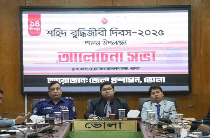 শহিদ বুদ্ধিজীবী দিবস-২০২৫ উপলক্ষ্যে জেলা প্রশাসকের সম্মেলন কক্ষে আজ ১৪ ডিসেম্বর ২০২৫ তারিখ সকাল ১১:০০ ঘটিকায় জনাব ডা. শামীম রহমান, জেলা প্রশাসক, ভোলা'র সভাপতিত্বে আলোচনা সভা অনুষ্ঠিত হয়। উক্ত আয়োজনে বিশেষ অতিথি হিসাবে উপস্থিত ছিলেন জনাব মোঃ শহিদুল্লাহ কাওছার, পিপিএম (বার) মহোদয়, পুলিশ সুপার, ভোলা মহোদয়।