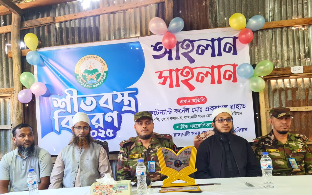 রাঙামাটিতে শীতার্ত এতিম ও অসহায় শিক্ষার্থীদের পাশে দাঁড়িয়েছে বাংলাদেশ সেনাবাহিনী। সেনাবাহিনীর রাঙামাটি সদর জোনের উদ্যোগে এতিম ও দরিদ্র মাদ্রাসা শিক্ষার্থীদের মাঝে শীতবস্ত্র ও কার্পেট বিতরণ করা হয়েছে।রবিবার (১৪ ডিসেম্বর ২০২৫) সকাল ১০টায় রাঙামাটি শহরের উত্তর ফরেস্ট কলোনি, বনরূপায় অবস্থিত তাহফীজুল কুরআন মাদ্রাসা ও এতিমখানায় এ মানবিক সহায়তা কর্মসূচি অনুষ্ঠিত হয়।অনুষ্ঠানে প্রধান অতিথি হিসেবে উপস্থিত ছিলেন রাঙামাটি সদর জোনের জোন কমান্ডার লেফটেন্যান্ট কর্নেল মোঃ একরামুল রাহাত, পিএসসি। তিনি শীত মৌসুমে সুবিধাবঞ্চিত শিশুদের সহায়তায় সেনাবাহিনীর মানবিক দায়িত্ব ও সামাজিক অঙ্গীকারের কথা তুলে ধরেন।অনুষ্ঠানে বিশেষ অতিথি হিসেবে উপস্থিত ছিলেন মোঃ রমজান উদ্দিন এবং মাওলানা ইমাম উদ্দিন, পরিচালক, আবু হুরাইরা নুরানি মাদ্রাসা। অনুষ্ঠানে সভাপতিত্ব করেন হযরত মাওলানা রহমত উল্লাহ, পরিচালক, আবু হুরাইরা নুরানি মাদ্রাসা।অনুষ্ঠানটি সঞ্চালনা করেন মোঃ আরিফুল ইসলাম।এ সময় মাদ্রাসার শিক্ষকবৃন্দ, শিক্ষার্থী ও স্থানীয় গণ্যমান্য ব্যক্তিবর্গ উপস্থিত ছিলেন। বক্তারা শীতকালে এতিম ও সুবিধাবঞ্চিত শিশুদের পাশে দাঁড়ানোর গুরুত্ব তুলে ধরেন এবং বাংলাদেশ সেনাবাহিনীর এ ধরনের মানবিক উদ্যোগের ভূয়সী প্রশংসা করেন।