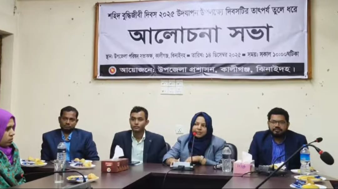 ঝিনাইদহ কালিগঞ্জ উপজেলা প্রশাসনের আয়োজনে শহীদ বুদ্ধিজীবী দিবস ২০২৫ উপলক্ষ্যে আলোচনা সভা অনুষ্ঠিত হয়েছে।