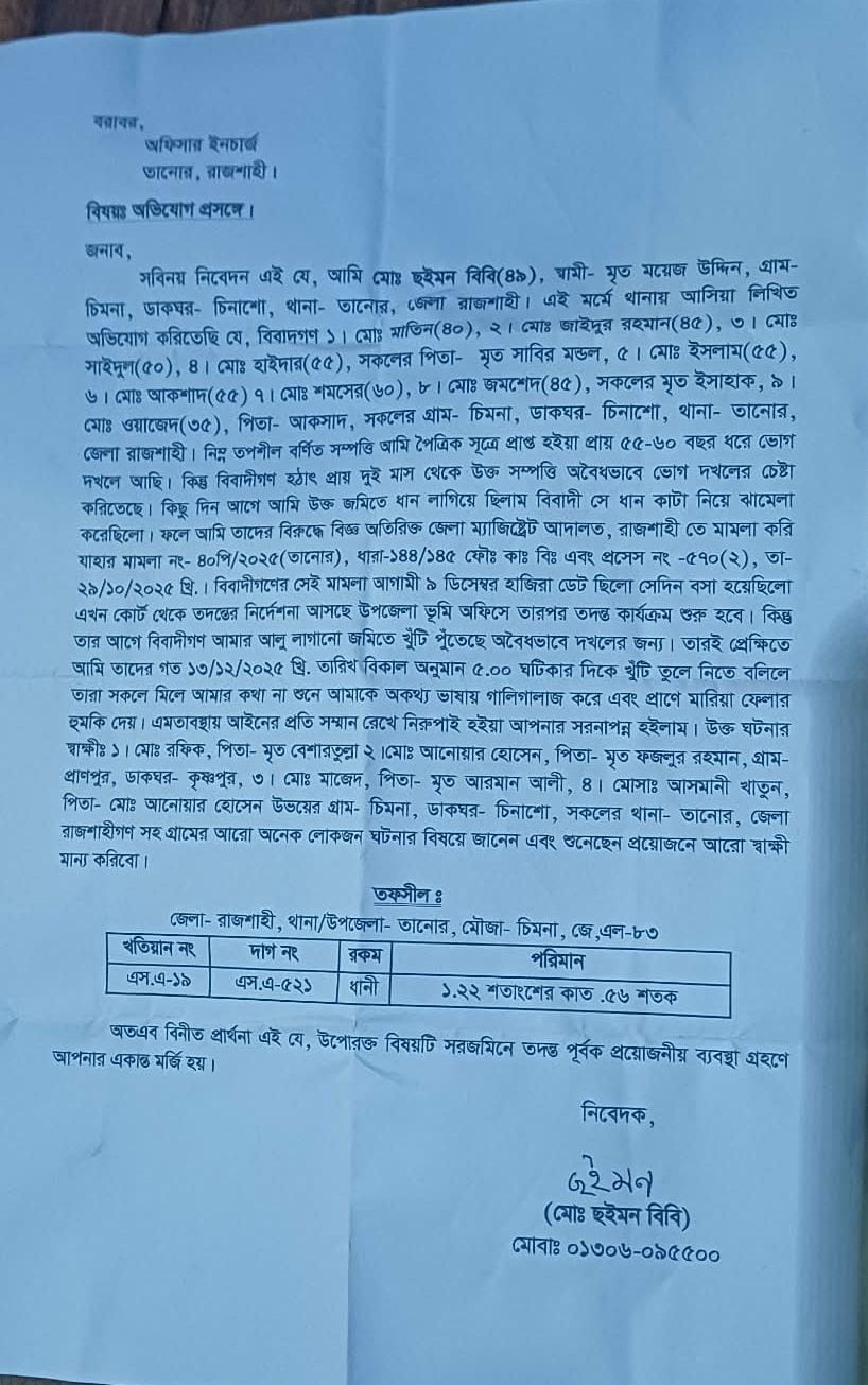 অভিযোগে আরও উল্লেখ করা হয়, সম্প্রতি হঠাৎ করে একই গ্রামের আব্দুল মাতিন ওই জমির একটি অংশ নিজের বলে দাবি করেন। গত ১৩ ডিসেম্বর শনিবার তিনি জমির একাংশে বাঁশের খুঁটি পুঁতে দখল নেওয়ার চেষ্টা করেন বলে অভিযোগ করা হয়েছে।