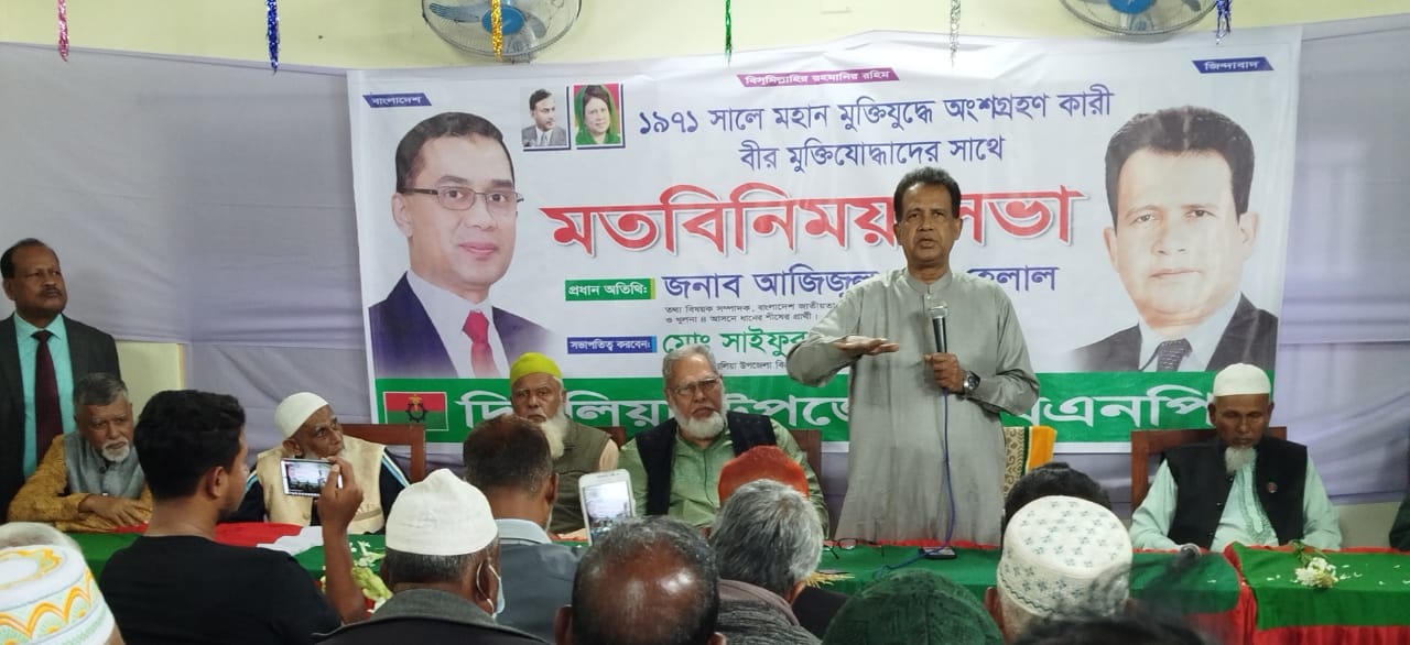 খুলনার দিঘলিয়া উপজেলার সদর দিঘলিয়া ইউনিয়ন পরিষদ মিলনায়তনে বিএনপির তথ্য বিষয়ক সম্পাদক খুলনা-৪ ধানের শীষের প্রার্থী আজিজুল বারী হেলাল প্রধান অতিথি থেকে বীর মুক্তিযোদ্ধাদের সাথে মত বিনিময় সভা করেন ১৪ ডিসেম্বর এর বিকেলে ৪ টা ৩০ মিনিটের দিকে। সভায় সভাপতিত্বে করেন মো: সাইফুর রহমান মিন্টু। এ সময় মুক্তিযোদ্ধাদের সন্তানরাও উপস্থিত ছিলেন।সভায় আজিজুল বারী হেলাল বলেন, মহান মুক্তিযুদ্ধের অংশগ্রহণ কারী বীর মুক্তিযোদ্ধাদের সাথে দিঘলিয়ায় আপনাদের সাথে কথা বলতে পেরে আমি খুবই আনন্দিত, একই সাথে আমি তাদেরকে স্বরণ করছি যারা মহান মুক্তিযুদ্ধে আহত ও শহীদ হয়েছেন, যাদের ত্যাগের বিনিময়ে আমার দেশ স্বাধীনতা পেলাম, তাই তাদেরকে কিভাবে ভুলতে পারি, কিন্তু আপনাদের সেই অসামান্য অবদান আজ একটি দলের জন্য বিলীন করার ষড়যন্ত্র চলছে, আজকে আপনাদের সামনেই আমার দল বিএনপি অঙ্গীকার করছে বাংলাদেশের স্বাধীনতা সার্বভৌম কোনো প্রকারে হাতছাড়া হতে দিবেনা।