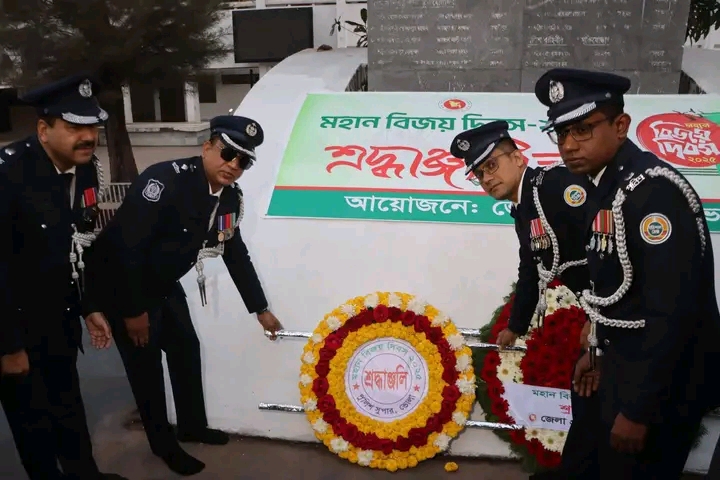 আজ ১৬ই ডিসেম্বর, মহান বিজয় দিবস ২০২৫। জেলা পুলিশ, ভোলা কর্তৃক মহান বিজয় দিবস ২০২৫ বিনম্র শ্রদ্ধা, যথাযথ মর্যাদা ও পূর্ণ ভাবগাম্ভীর্যের মধ্য দিয়ে পালন করা হয়েছে।মহান বিজয় দিবসের এই মহেন্দ্রক্ষণে ভোলা জেলা পুলিশের পক্ষ থেকে সূর্যোদয়ের সাথে সাথে শহীদ মুক্তিযোদ্ধা স্মৃতিস্তম্ভে পুষ্পস্তবক অর্পণ করে দেশের জন্য জীবন উৎসর্গকারী সকল শহীদ মুক্তিযোদ্ধাদের স্মৃতির প্রতি গভীর শ্রদ্ধা নিবেদন করেন ভোলা জেলার সম্মানিত পুলিশ সুপার জনাব মোঃ শহিদুল্লাহ কাওছার, পিপিএম (বার) মহোদয়।পুলিশ সুপার মহোদয় শহীদ মুক্তিযোদ্ধা স্মৃতিস্তম্ভে পুষ্পস্তবক অর্পণ শেষে শহীদদের প্রতি সন্মান প্রদর্শণ করেন ও সেখানে কিছুক্ষণ নীরবতা পালন করেন এবং শহীদদের আত্মার শান্তি কামনা করে বিশেষ মোনাজাত করা হয়।এ সময় জনাব মোঃ সোহান সরকার, অতিরিক্ত পুলিশ সুপার (প্রশাসন ও অর্থ), মোঃ ইব্রাহীম, অতিরিক্ত পুলিশ সুপার (সদর সার্কেল) সহ জেলা পুলিশের বিভিন্ন পদমর্যাদার পুলিশ সদস্য ও জেলা প্রশাসনের কর্মকর্তা-কর্মচারীবৃন্দ, বিভিন্ন সরকারি-বেসরকারী প্রতিষ্ঠানের কর্মকর্তা কর্মচারীবৃন্দ, বীর মুক্তিযোদ্ধাগণ, বিভিন্ন পর্যায়ের রাজনৈতিক নেতাকর্মীবৃন্দ, বিভিন্ন শিক্ষা প্রতিষ্ঠানের শিক্ষক-শিক্ষিকা, ছাত্র-ছাত্রীবৃন্দ, সাংবাদিকবৃন্দ ও সর্বস্তরের জনসাধারণ উপস্থিত ছিলেন।