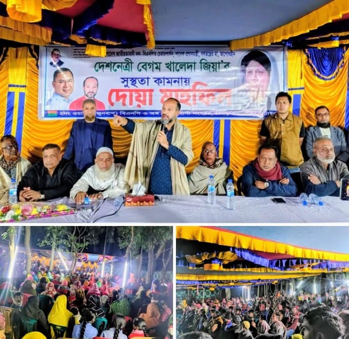 টাংগাইল-৩ (ঘাটাইল) উপজেলার দিগড় ইউনিয়নের ২নং ওয়ার্ডের নজুনবাগ গ্রামে বাংলাদেশ জাতীয়তাবাদী দল (বিএনপি)-এর চেয়ারপারসন ও সাবেক প্রধানমন্ত্রী দেশনেত্রী বেগম খালেদা জিয়ার সুস্থতা কামনায় দোয়া মাহফিল অনুষ্ঠিত হয়েছে।সোমবার (১৫ ডিসেম্বর ২০২৫) বিকেলে আয়োজিত এ দোয়া মাহফিলে প্রধান অতিথি হিসেবে উপস্থিত ছিলেন বিএনপির কেন্দ্রীয় নির্বাহী কমিটির অন্যতম সদস্য এবং টাংগাইল-৩ (ঘাটাইল) আসনে বিএনপির মনোনীত ধানের শীষ প্রতীকের প্রার্থী এডভোকেট এসএম ওবায়দুল হক নাসির।দোয়া মাহফিলে বক্তব্য রাখতে গিয়ে এডভোকেট এসএম ওবায়দুল হক নাসির বলেন, “দেশনেত্রী বেগম খালেদা জিয়া গণতন্ত্র ও মানুষের ভোটাধিকারের প্রতীক। তিনি দীর্ঘদিন নানা শারীরিক জটিলতায় ভুগছেন। মহান আল্লাহর কাছে তাঁর দ্রুত সুস্থতা কামনা করছি।তিনি আরও বলেন, দেশ ও জাতির ক্রান্তিকালে বেগম খালেদা জিয়ার সুস্থতা গণতন্ত্রকামী মানুষের জন্য অত্যন্ত গুরুত্বপূর্ণ।অনুষ্ঠানে ঘাটাইল উপজেলা বিএনপি, পৌর বিএনপি এবং দলের বিভিন্ন অঙ্গ ও সহযোগী সংগঠনের নেতাকর্মীরা উপস্থিত ছিলেন। দোয়া মাহফিলে দেশনেত্রীর রোগমুক্তি, দেশের শান্তি এবং জাতির কল্যাণ কামনা করে বিশেষ মোনাজাত পরিচালনা করা হয়।দোয়া মাহফিল শেষে নেতাকর্মীরা ঐক্যবদ্ধভাবে বিএনপিকে আগামী জাতীয় নির্বাচনে ধানের শীষ প্রতীককে নির্বাচিত করার জন্য অঙ্গীকার ব্যক্ত করেন।