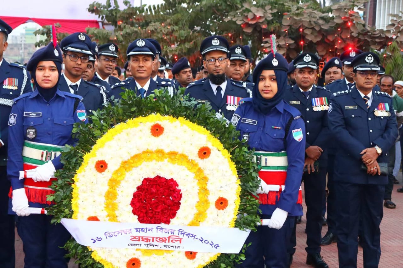 মহান বিজয় দিবস উপলক্ষে বিজয় স্মৃতিস্তম্ভে স্বাধীনতা যুদ্ধে আত্মদানকারী সকল বীর শহিদদের প্রতি ফুল দিয়ে বিনম্র শ্রদ্ধাঞ্জলি নিবেদন করল জেলা পুলিশ যশোর।