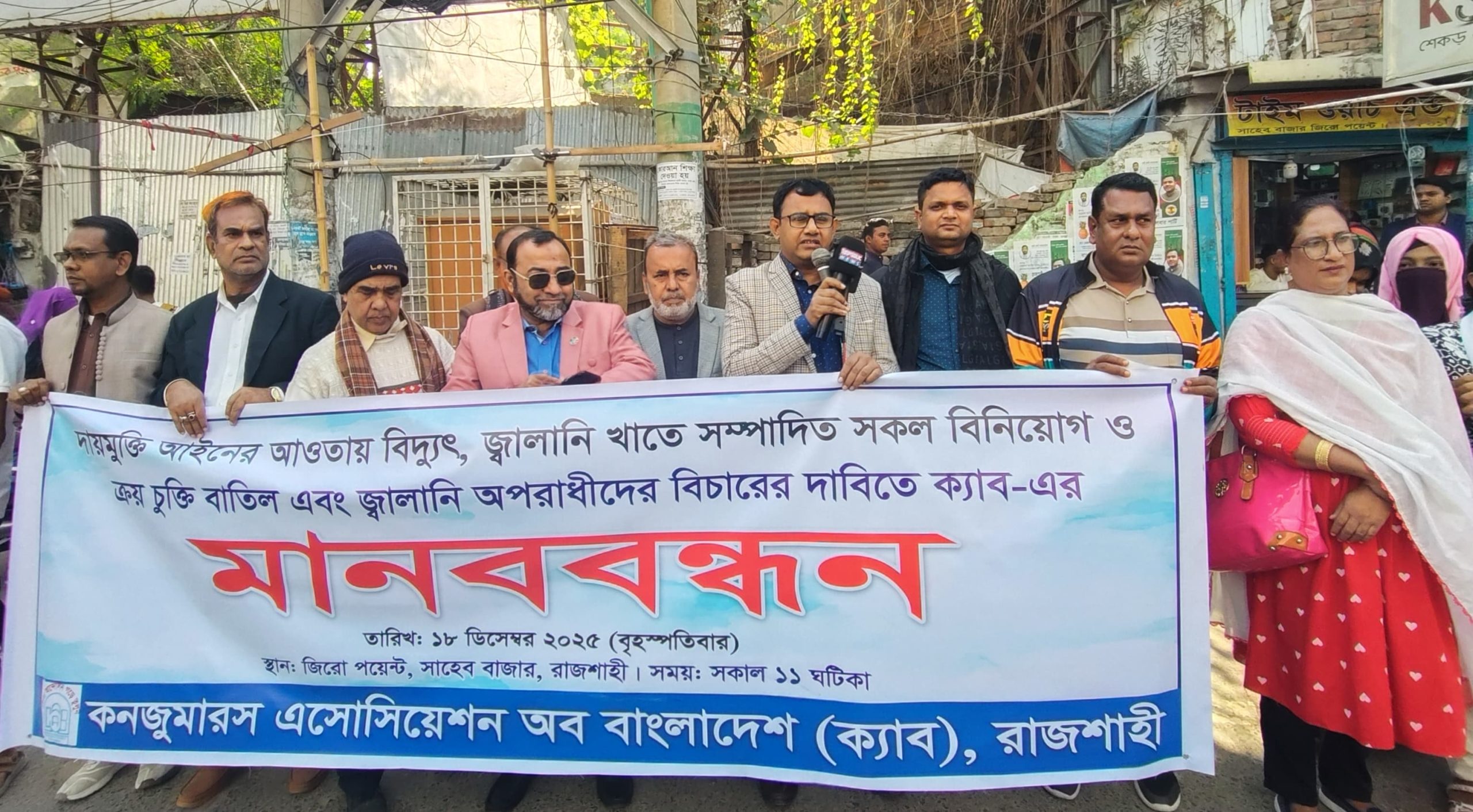 বৃহস্পতিবার (১৮ ডিসেম্বর ২০২৫) সকাল ১১টায় রাজশাহী নগরীর সাহেব বাজার জিরো পয়েন্টে কনজুমার অ্যাসোসিয়েশন অব বাংলাদেশ (ক্যাব) রাজশাহী জেলা শাখার উদ্যোগে এ মানববন্ধন অনুষ্ঠিত হয়। মানববন্ধনে সভাপতিত্ব করেন ক্যাব রাজশাহীর সহ-সভাপতি মিজানুর রহমান। কর্মসূচি পরিচালনা করেন ক্যাব রাজশাহীর সাধারণ সম্পাদক মোঃ গোলাম মোস্তফা মামুন।