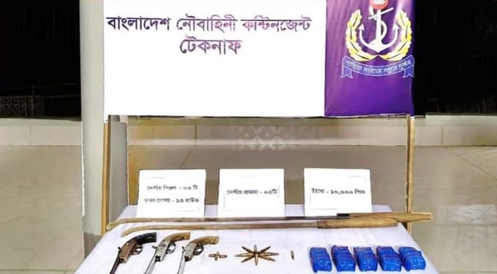 কক্সবাজারের টেকনাফে দেশের অভ্যন্তরীণ আইনশৃঙ্খলা পরিস্থিতি স্বাভাবিক রাখা ও সার্বিক নিরাপত্তা নিশ্চিত করতে নিয়মিত অভিযানের অংশ হিসেবে টেকনাফে অভিযান চালিয়ে আগ্নেয়াস্ত্র, গোলাবারুদ ও বিপুল পরিমাণ ইয়াবা উদ্ধার করেছে বাংলাদেশ নৌবাহিনী।নৌবাহিনীর সূত্রে জানা যায়, শুক্রবার (২০ ডিসেম্বর) দিবাগত রাতে গোপন সংবাদের ভিত্তিতে টেকনাফ উপজেলার হ্নীলা ইউনিয়নে এ অভিযান পরিচালনা করা হয়। অভিযানে নৌবাহিনীর বিশেষায়িত ফোর্স স্কোয়াডস ও নৌবাহিনী কন্টিনজেন্ট অংশ নেয়। এ সময় টেকনাফ থানার পুলিশ সদস্যরাও অভিযানে সহযোগিতা করেন।অভিযানকালে শীর্ষ সন্ত্রাসী হিসেবে পরিচিত লম্বা মিজানের বাড়িতে তল্লাশি চালিয়ে দেশি ও বিদেশি বিভিন্ন ধরনের অস্ত্র উদ্ধার করা হয়।উদ্ধারকৃত সামগ্রীর মধ্যে রয়েছে তিনটি পিস্তল, ভিন্ন মডেলের ৯ রাউন্ড লাইভ অ্যামুনিশন, ৪ রাউন্ড পিস্তল বল, দুটি দেশীয় অস্ত্র এবং ১০ হাজার পিস ইয়াবা।নৌবাহিনী জানায়, উদ্ধারকৃত অস্ত্র, গোলাবারুদ ও ইয়াবা পরবর্তী আইনানুগ ব্যবস্থা গ্রহণের জন্য টেকনাফ থানায় হস্তান্তর করা হয়েছে।উল্লেখ্য, উপকূলীয় অঞ্চলসহ দায়িত্বপূর্ণ এলাকাগুলোতে অবৈধ অস্ত্র, মাদক ও দুষ্কৃতিকারীদের দমনে বাংলাদেশ নৌবাহিনী নিরলসভাবে কাজ করে যাচ্ছে। জনসাধারণের নিরাপত্তা ও কল্যাণে এ ধরনের অভিযান ভবিষ্যতেও অব্যাহত থাকবে বলে জানিয়েছে।