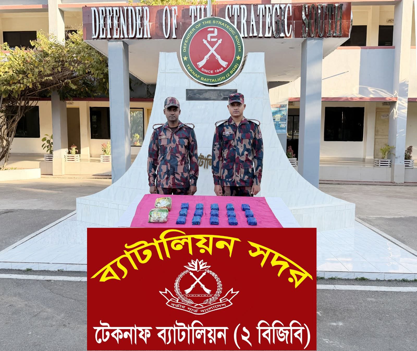কক্সবাজারের টেকনাফ দেশের সীমান্ত সুরক্ষা ও মাদকের বিরুদ্ধে 'জিরো টলারেন্স' নীতি বাস্তবায়নে টেকনাফ ব্যাটালিয়ন (২ বিজিবি) গত ২০ এবং ২১ ডিসেম্বর ২০২৫ তারিখ টেকনাফ উপজেলার নাফ নদী সংলগ্ন এসআর খাল ও পার্শ্ববর্তী কেওড়া জঙ্গলে এবং প্রধানমন্ত্রীর কার্যালয় এলাকায় পৃথক পৃথক অভিযানে ভয়াল মাদক ক্রিস্টাল মেথ আইসসহ বিপুল পরিমান ইয়াবা ট্যাবলেট জব্দ করেছে।