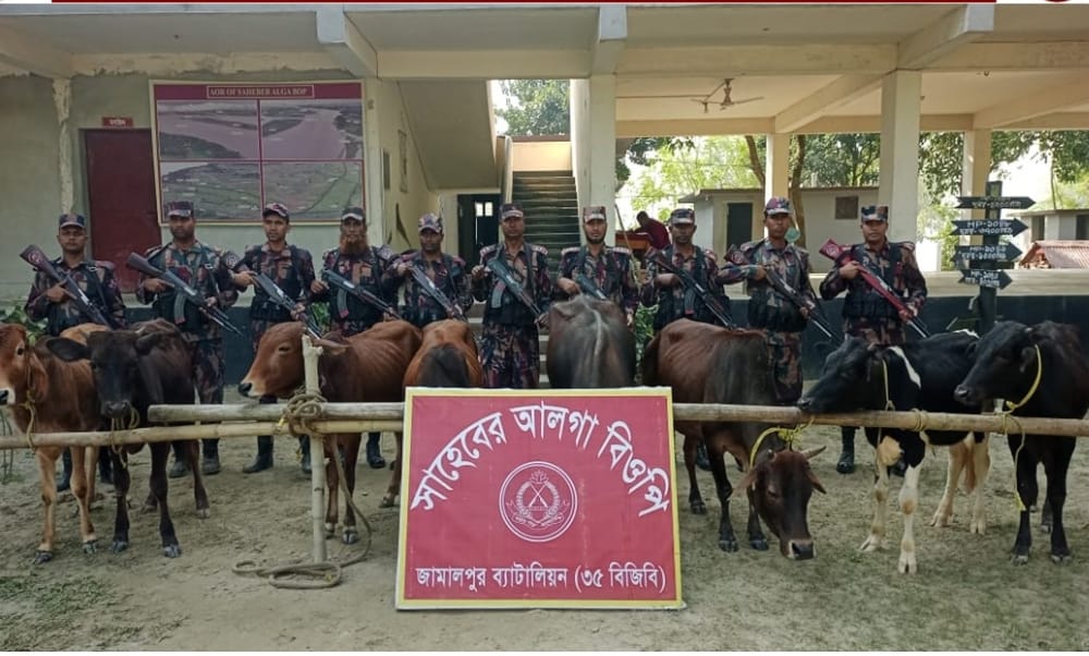 "চোরাচালানের বিরুদ্ধে বিন্দুমাত্র ছাড় নয়" এমন মনোভাবকে সামনে রেখে জামালপুর ব্যাটালিয়নের (৩৫ বিজিবি) অধিনায়ক লেঃ কর্নেল হাসানুর রহমান, পিএসসি এর সার্বিক দিক নির্দেশনায় চোরাচালানী অভিযান পরিচালনা করা হয়। অদ্য ২২ ডিসেম্বর ২০২৫ তারিখ সোমবার আনুমানিক সকাল ০৬:০০ ঘটিকায় নিজস্ব গোয়েন্দা তথ্যের ভিত্তিতে জামালপুর ব্যাটালিয়নের (৩৫ বিজিবি) অধিনস্থ সাহেবের আলগা বিওপি কর্তৃক চোরাচালান বিরোধী অভিযান পরিচালনাকালে সীমান্ত পিলার ১০৫১/১-এস হতে আনুমানিক ১০০ গজ বাংলাদেশের অভ্যন্তরে চর ইটালুকান্দা নামক স্থান হতে ভারতীয় গরু-০৮টি এবং মহিষ-০১টি আটক করতে সক্ষম হয়। জব্দকৃত ভারতীয় গরু এবং মহিষ রৌমারী কাষ্টমস এ জমা করার কার্যক্রম প্রক্রিয়াধীন।বিজিবি মহাপরিচালক মহোদয় কর্তৃক ঘোষিত মাদক ও চোরাচালনের বিরুদ্ধে জিরো টলারেন্স নীতি বাস্তবায়নের লক্ষ্যে সীমান্তে মাদক ও সকল ধরনের চোরাচালান পাচার রোধকল্পে এবং সীমান্ত সুরক্ষায় দৃঢ়তার সাথে দায়িত্ব পালন করে যাচ্ছে জামালপুর ব্যাটালিয়ন (৩৫ বিজিবি)।