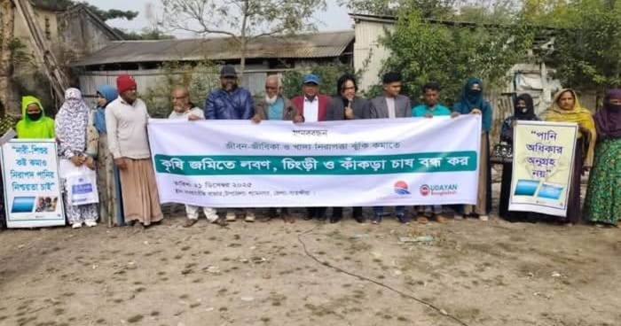 সাতক্ষীরার শ্যামনগর উপজেলার নওয়াবেঁকী বাজারে কৃষি জমিতে লবন, কাঁকড়া ও চিংড়ি চাষের আগ্রাসন বন্ধের দাবিতে মানববন্ধন হয়েছে। রোববার ২১ ডিসেম্বর বেলা ১১টায় নওয়াবেঁকী বাজারের পাশে উক্ত মানববন্ধন অনুষ্ঠিত হয়। কোস্ট ফাউন্ডেশন ও উদয়ন বাংলাদেশের উদ্যোগে অনুষ্ঠিত মানববন্ধনে নানা বয়সী স্থানীয় শতাধিক নারী অংশ নেয়। এছাড়াও জনপ্রতিনিধিদের পাশাপাশি সংবাদকর্মীরা মানববন্ধনে বক্তব্য রাখেন। মানববন্ধনে অংশ নেয়া নারীরা বলেন কৃষি জমিতে লবনাক্ত পানি প্রবেশ করিয়ে চিংড়ি ও কাঁকড়া চাষের ফলে ফসলি জমি নষ্ট হচ্ছে, মার্টি উর্বরতা হারাচ্ছে। যা স্থানীয় মানুষের জীবন-জীবিকা মারাত্বকভাবে ক্ষতিগ্রস্থ করছে। যার প্রেক্ষিতে খাদ্য উৎপাদন হ্রাস পাচ্ছে এবং কৃষি নির্ভর জনগোষ্ঠী দীর্ঘেিময়াদী ঝুঁকির মুখে পড়ছে। তাই জীবন-জীবিকা ও খাদ্য নিরাপত্তা নিশ্চিতে কৃষি জমিতে লবন, কাঁকড়া ও চিংড়ি চাষ বন্ধ করা জরুরী। প্রয়োজনে সেজন্য কার্যকর আইন প্রনয়নসহ ক্ষতিগ্রস্থদের বিকল্প আয় ও টুনর্বাসন নিশ্চিত করতে হবে। স্থানীয় জনগোষ্ঠীর সম্মতি ছাড়া ভুমি ব্যবহার পরিবর্তন বন্ধসহ কৃষি ফিরতে হবে।উদয়ন বাংলাদেশের নির্বাহী পরিচালক শেখ আসাদের সভাপতিত্বে ও কোস্ট ফাউন্ডেশনের এম এ হাসানের সঞ্চালনায় মানববন্ধনে বক্তব্য রাখেন স্থানীয় নারী প্রতিনিধি ঝরনা বেগম, প্রেসক্লাব সভাপতি সামিউল মনির, জনপ্রতিনিধি শওকাত হোসেন, তারুন্যের প্রতিনিধি ইমরান পারভেজ, উন্নয়ন কর্মী শিবু প্রসাদ বৈদ্য, নাজমা আবু প্রমুখ। ভুক্তোভোগী নারীরা নিজেদের বক্তব্যে জানান, লবনাক্ততা বৃদ্ধির ফলে উপকুলের নারীরা সবচেয়ে বেশী ক্ষতির শিকার হচ্ছে। স্বাস্থ্য ঝুঁকি বৃদ্ধির পাশাপাশি কৃষি নির্ভর পরিবারগুলো এলাকা ছেড়ে যেতে বাধ্য হচ্ছে। মানববন্ধনে অংশ নেয়া বক্তারা প্রাকৃতিক দুর্যোগের কথা উল্লেখ করে স্থানীয় জনগোষ্ঠীর স্বার্থে জোন ভিত্তিক কৃষি ও কাঁকড়া এবং চিংড়ি চাষের প্রস্তাব করেন। এছাড়া তীব্র খাবার পানির সংকট নিরসনের পাশাপাশি উপকুল বাঁধ সংরক্ষনে পার্শ্ববর্তী নদী থেকে বালু উত্তোলন বন্ধের দাবি জানান। এছাড়া খাদ্য নিরাপত্তা নিশ্চিতে খাল খননসহ পুনঃখনন এবং এক ফসলী জমিকে সারা বছর ধরে চাষের আওতায় নেয়ার কৌশল নির্ধারণেরও দাবি জানান।