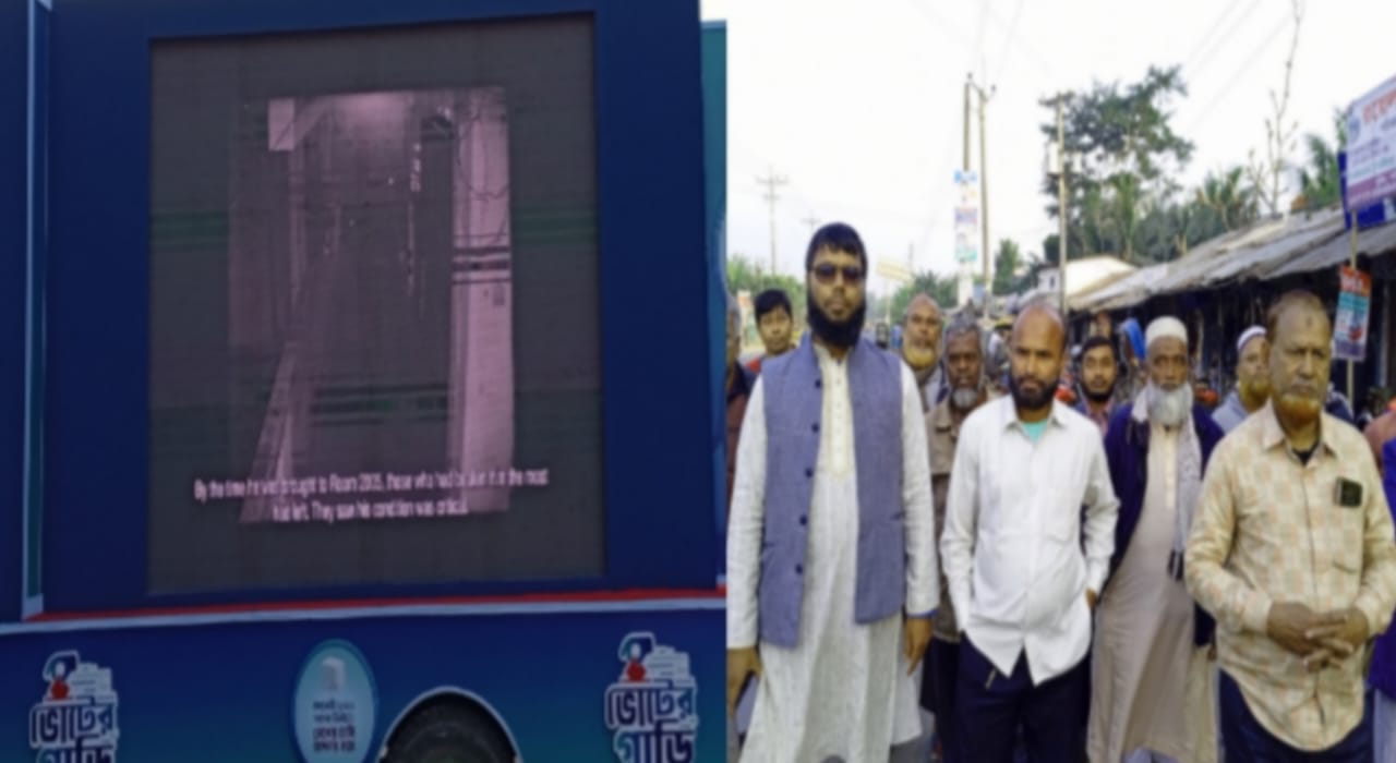 সরেজমিনে দেখা যায়, সাইনবোর্ড বাজারে নির্বাচন কমিশনের এই আয়োজন ঘিরে শত শত উৎসুক মানুষের ভিড়। প্রজেক্টরের মাধ্যমে বড় পর্দায় ভিডিও প্রদর্শনী করে সাধারণ মানুষকে বোঝানো হচ্ছে—কীভাবে নির্ভুলভাবে গণভোটে অংশগ্রহণ করতে হবে এবং তাদের একটি ভোট দেশের জন্য কতটা গুরুত্বপূর্ণ।