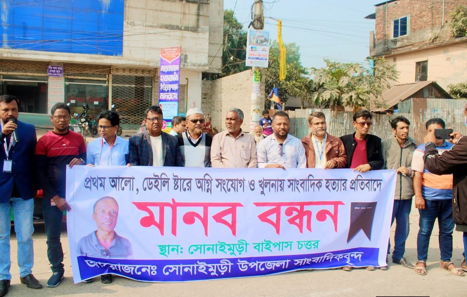মঙ্গলবার সকাল ১১টায়, দৈনিক দিনকালের প্রতিনিধি নূর মোহাম্মদ সবুজ-এর সঞ্চালনায় সোনাইমুড়ী বাইপাস চত্বরে আয়োজিত এই মানববন্ধনে উপজেলার বিভিন্ন প্রিন্ট, ইলেকট্রনিক ও অনলাইন মিডিয়ায় কর্মরত সাংবাদিকরা স্বতঃস্ফূর্তভাবে অংশগ্রহণ করেন।