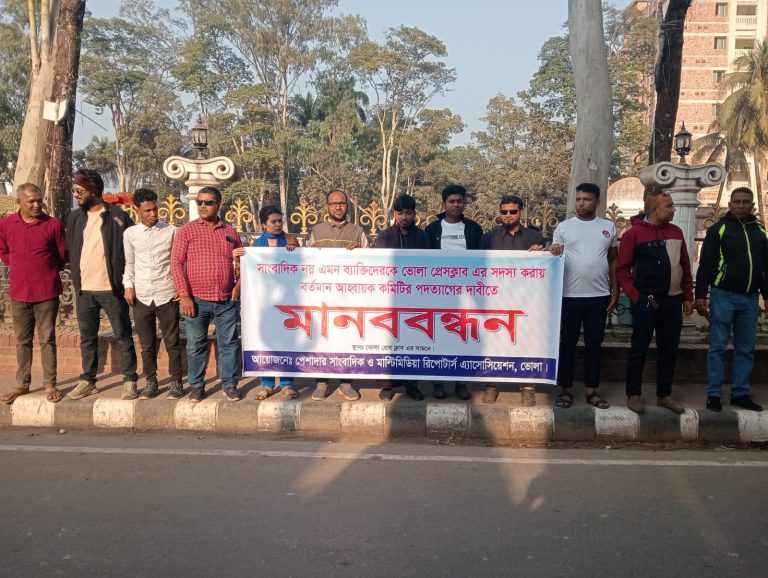 সাংবাদিক নয় এমন ব্যাক্তিদের কে ভোলা প্রেসক্লাবের সদস্য করায় আহ্বায়ক কমিটির পদত্যাগের দাবিতে পেশাদার সাংবাদিকদের মানববন্ধন
