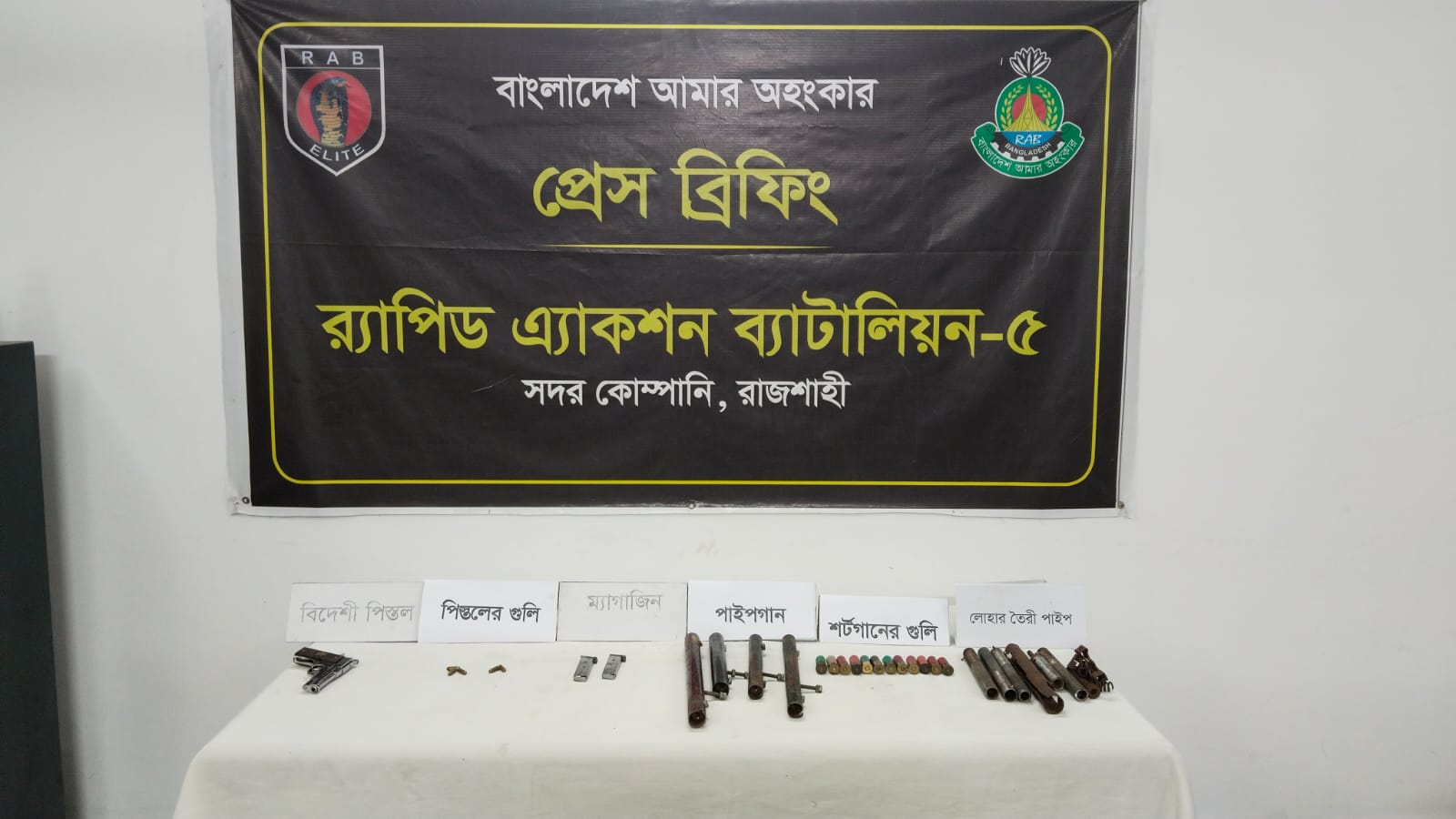 রাজশাহীর তানোর থানা এলাকায় র্যাপিড অ্যাকশন ব্যাটালিয়ন (র্যাব)-৫ এর পৃথক অভিযানে একটি বিদেশি পিস্তল, গুলি ও বিপুল পরিমাণ দেশীয় অস্ত্র উদ্ধার করা হয়েছে।র্যাব সূত্রে জানা গেছে, দেশের সার্বিক আইনশৃঙ্খলা পরিস্থিতি স্বাভাবিক রাখতে নিয়মিত অভিযানের অংশ হিসেবে গোপন সংবাদের ভিত্তিতে র্যাব-৫ রাজশাহীর সদর কোম্পানির একটি অপারেশন দল ২৮ ডিসেম্বর ২০২৫ খ্রিস্টাব্দ রাত ১২টা ৩০ মিনিট থেকে রাত ১টা ৪০ মিনিট পর্যন্ত তানোর থানাধীন চুনিয়াপাড়া গ্রামে পৃথক অভিযান পরিচালনা করে।অভিযানকালে এন্তাজ আলীর বসতবাড়ীর পশ্চিম পাশে গরুর গোয়াল ঘরের পেছনে রান্নার লাকড়ির নিচে, একই এলাকার আব্দুস সোবাহানের বসতবাড়ীর উত্তর পাশে খড়ি রাখার ঘরের খড়ির নিচে এবং জয়নাল আবেদীনের বসতবাড়ীর উত্তর পাশে খড়ি রাখার ঘরের খড়ির নিচে তল্লাশি চালিয়ে পরিত্যক্ত অবস্থায় অস্ত্রগুলো উদ্ধার করা হয়।উদ্ধারকৃত অস্ত্রের মধ্যে রয়েছে কাঠের হাতলযুক্ত একটি বিদেশি পিস্তল, যার গায়ে ইংরেজিতে Made in USA 7.0-5 MM লেখা রয়েছে, দুটি খালি সিলভার রঙের ম্যাগাজিন, পাঁচ রাউন্ড পিস্তলের গুলি, বারোটি শর্টগানের গুলি, চারটি পাইপগান এবং ছয়টি চিকন পাইপসহ অস্ত্র তৈরির খুচরা যন্ত্রাংশ।র্যাব জানায়, উদ্ধারকৃত অস্ত্র ও গুলির বিষয়ে স্থানীয়দের জিজ্ঞাসাবাদ করা হলেও কেউ এর মালিকানা সম্পর্কে কোনো তথ্য দিতে পারেনি। প্রাথমিক অনুসন্ধানেও অস্ত্রগুলোর মালিক শনাক্ত করা সম্ভব হয়নি।উদ্ধার করা অস্ত্র, গোলাবারুদ ও সংশ্লিষ্ট মালামাল আইনগত প্রক্রিয়া শেষে তানোর থানায় হস্তান্তর করা হয়েছে। এ ঘটনায় পরবর্তী আইনানুগ ব্যবস্থা গ্রহণ প্রক্রিয়াধীন রয়েছে।র্যাব-৫ জানায়, অবৈধ অস্ত্র ও সন্ত্রাসবিরোধী অভিযান ভবিষ্যতেও চলমান থাকবে