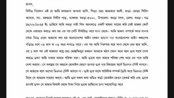 মোঃ শিবলু রহমান বিশেষ প্রতিনিধি বগুড়া সদরের ফারজানা আক্তারের স্বামী মোঃ আলআমিন আলী (ঠিকানা: মধুপুর, বগুড়া সদর) পুলিশ হেডকোয়ার্টার্সে পাঠানো এক আবেদনে গুরুতর অভিযোগ তুলেছেন। তিনি জানিয়েছেন, গত ১৯/০২/২০২৫ তারিখে ...বিস্তারিত পড়ুন
