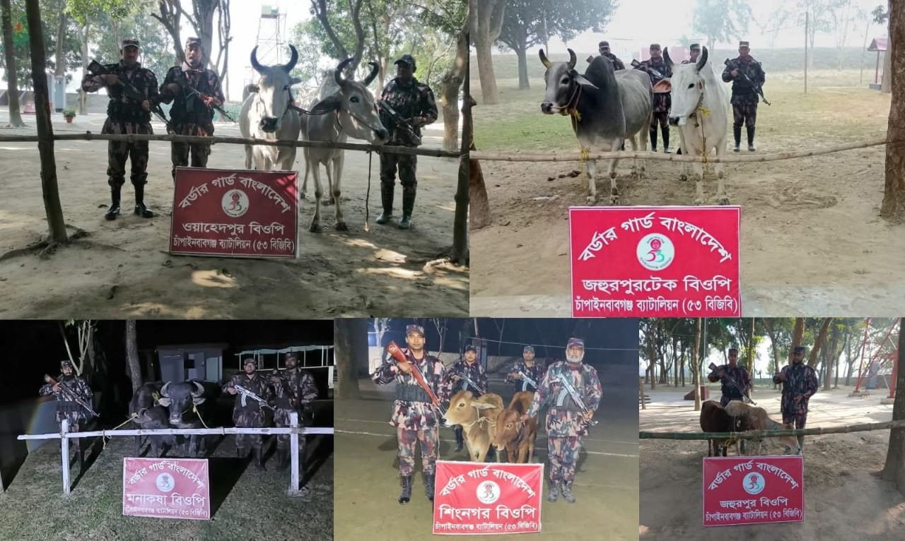 গোপন তথ্যের ভিত্তিতে আজ ৩১ ডিসেম্বর ২০২৫ তারিখ সকাল ০৮টা হতে সন্ধ্যা ০৭টা পর্যন্ত ৫৩ বিজিবি এর বিশেষ টহলদল কর্তৃক পৃথক ০৫টি অভিযান পরিচালনা করে ভারতীয় ০৮টি গরু ও ০২টি মহিষ জব্দ করা হয়। অভিযানসমূহে ৫৩ বিজিবির অধীনস্থ জহুরপুরটেক বিওপি হতে চাঁপাইনবাবগঞ্জ সদর থানাধীন চরবাগডাংগা ইউনিয়নের সাদ্দামের চর এলাকা থেকে ০২টি গরু, ওয়াহেদপুর বিওপি হতে শিবগঞ্জ থানাধীন পাঁকা ইউনিয়নের দশরশিয়া গ্রাম থেকে ০২টি গরু, জহুরপুর বিওপি হতে শিবগঞ্জ থানাধীন সূর্যনারায়ণপুর ইউনিয়নের সাতরশিয়া গ্রাম থেকে ০২টি গরু, শিংনগর বিওপি হতে শিবগঞ্জ থানাধীন মনাকষা ইউনিয়নের শাহাপাড়া গ্রাম থেকে ০২টি গরু এবং মনাকষা বিওপি হতে শিবগঞ্জ থানাধীন মনাকষা ইউনিয়নের বোগলাউড়ি গ্রাম থেকে ০২টি মহিষ জব্দ করে। জব্দকৃত ভারতীয় গরু ও মহিষের আনুমানিক বাজার মূল্য ১৮ লক্ষ টাকা। জব্দকৃত গরু ও মহিষ চাঁপাইনবাবগঞ্জ শুল্ক কার্যালয়ে জমা করা হয়েছে।