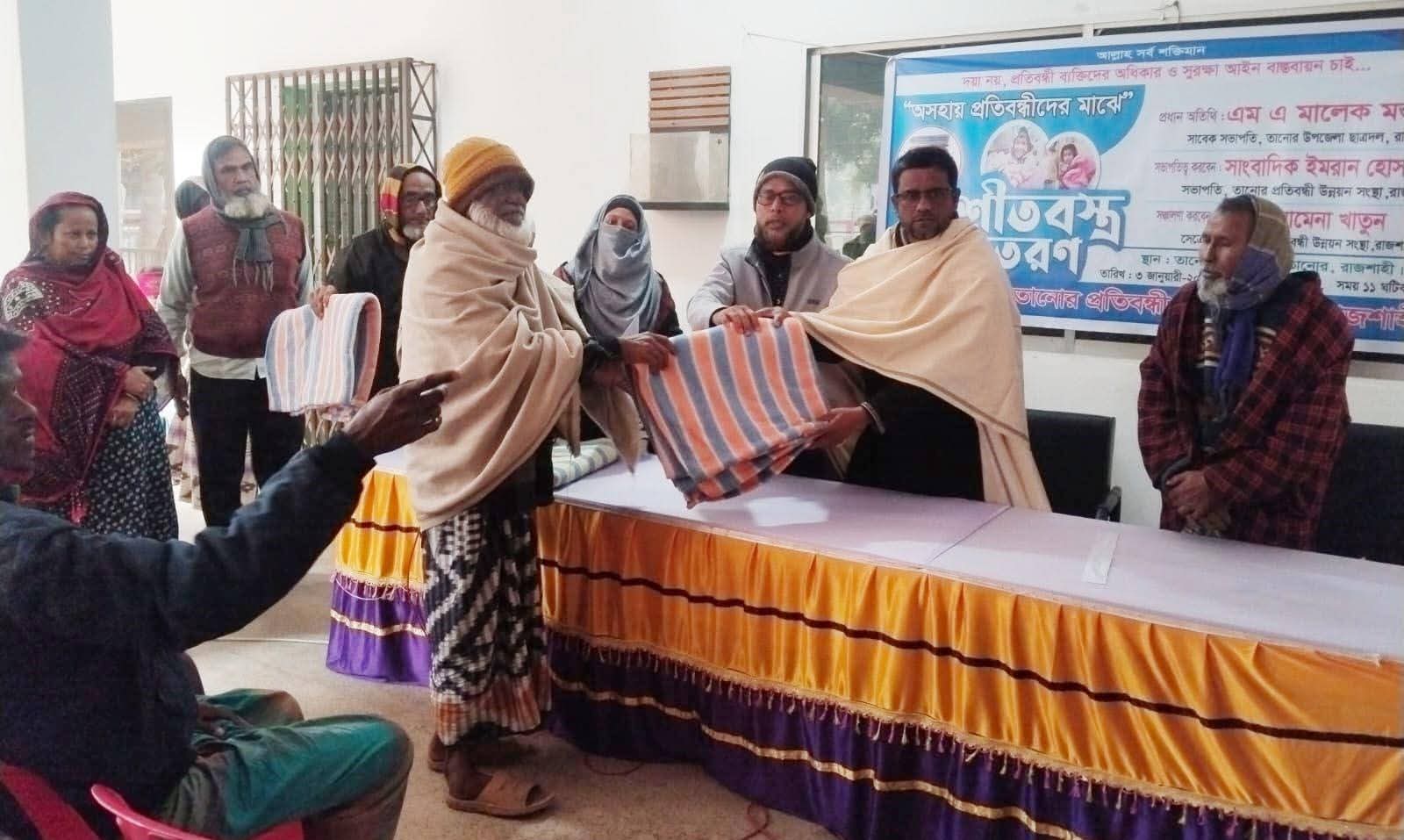 রাজশাহীর তানোরে অসহায় প্রতিবন্ধী ব্যক্তিদের মাঝে শীতবস্ত্র বিতরণ করা হয়েছে। শনিবার ৩ জানুয়ারি দুপুর দুইটার দিকে তানোর পৌরভবন চত্বরে তানোর প্রতিবন্ধী উন্নয়ন সংস্থার আয়োজনে এবং উপজেলা প্রশাসনের সহযোগিতায় শতাধিক প্রতিবন্ধী ব্যক্তির মাঝে কম্বল বিতরণ করা হয়।শীতবস্ত্র বিতরণ অনুষ্ঠানে প্রধান অতিথি হিসেবে বক্তব্য দেন তানোর উপজেলা ছাত্রদলের সাবেক সভাপতি ও আসন্ন নির্বাচনে তানোর পৌরসভার মেয়রপ্রার্থী এম এ মালেক মন্ডল। তিনি বলেন, প্রতিবন্ধী ব্যক্তিরা সমাজের অবিচ্ছেদ্য অংশ। অন্যান্য নাগরিকের মতো জনপ্রতিনিধি নির্বাচনে তারাও গুরুত্বপূর্ণ ভূমিকা রাখেন। তাই প্রতিবন্ধী ব্যক্তিদের সমানভাবে সরকারি সুযোগ-সুবিধা পাওয়ার অধিকার রয়েছে। তিনি সরকারি বিভিন্ন বরাদ্দ ও সামাজিক সহায়তা কার্যক্রমে প্রতিবন্ধী ব্যক্তিদের অগ্রাধিকার দেওয়ার জন্য সংশ্লিষ্ট সবার প্রতি আহ্বান জানান।তানোর প্রতিবন্ধী উন্নয়ন সংস্থার সভাপতি সাংবাদিক ইমরান হোসাইনের সভাপতিত্বে অনুষ্ঠিত অনুষ্ঠানে বিশেষ অতিথি হিসেবে বক্তব্য দেন সংস্থার সহসভাপতি আব্দুল গাফ্ফার, মুন্ডুমালা পৌরসভার ৩ নম্বর ওয়ার্ড প্রতিবন্ধী কমিটির সভাপতি ফজলুর রহমান ও সেক্রেটারি আজিজুল হক।অনুষ্ঠানে সংস্থার সেক্রেটারি আমেনা খাতুনের সঞ্চালনায় আরও বক্তব্য দেন গোল্লাপাড়া বাজার বণিক সমিতির সেক্রেটারি সাংবাদিক টিপু সুলতানসহ বিভিন্ন শ্রেণি-পেশার গণ্যমান্য ব্যক্তিবর্গ।