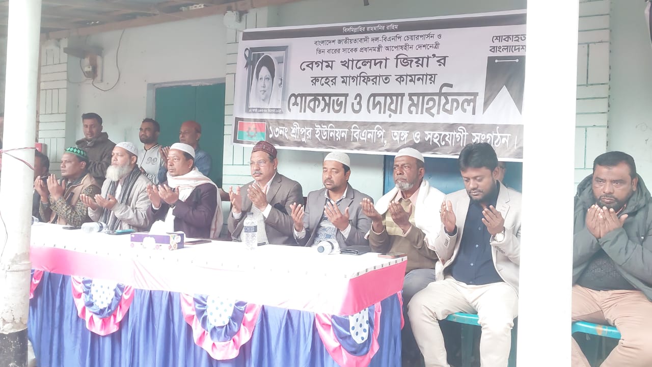 আজ শনিবার বিকাল ৩ টায় সুন্দরগঞ্জ উপজেলার ১৩নং শ্রীপুর ইউনিয়ন বিএনপির আয়োজনে ধর্মপুর ডাক বাংলো মাঠে মরহুমা বেগম খালেদা জিয়া সাবেক তিন বারের প্রধান মন্ত্রীর তার রূহের মগফেরাত কামনায় দোয়া মাহফিল অনুষ্ঠিত।১৩নং শ্রীপুর ইউনিয়ন বিএনপি ও সকল সহযোগী সংগঠন এর উদ্যোগে আয়োজন করা হয়। উক্ত দোয়া মাহফিলে সভাপতিত্ব করেন শ্রীপুর ইউনিয়ন বিএনপির আহবায়ক সহকারী অধ্যাপক শাহাদাত হোসেন সেলিম পবিত্র কুরআন তেলোয়াত করেন হাফেজ সাজ্জাদ হোসেন।প্রধান অতিথি হিসেবে উপস্থিত ছিল ২৯ গাইবান্ধা -১ সুন্দরগঞ্জ আসনের বিএনপি মনোনীত পদ প্রর্থী অধ্যাপক ডাঃ খন্দকার জিয়াউল ইসলাম মোহাম্মদ আলী, সুন্দরগঞ্জ উপজেলা বিএনপির আহবায়ক মোঃ বাবুল আহমেদ, উপজেলা বিএনপি সদস্য সচিব মাহমুদুল ইসলাম প্রামানিক মহামুদ,শ্রীপুর ইউনিয়ন বিএনপির সদস্য সচিব ছামিউল ইসলাম টিটন সহ সকল নেতা কর্মি ও সাধারণ মানুষ দোয়য় অংশ গ্রহণ করে।উক্ত অনুষ্ঠানে বেগম খালেদা জিয়ার দীর্ঘ রাজনৈতিক কর্ম কান্ড সম্পর্কে অননক স্মৃতি চারন করে বক্তব্য প্রদান করেন।গণতন্ত্র প্রতিষ্ঠার জন্য দীর্ঘ লরাই সংগ্রাম করতে গিয়ে দীর্ঘ দিনের আবাস স্হল থেকে বিতাড়িত হতে হয়েছে।সন্তানকে হারিয়ে ছেন। সৈরাচারী শাষনের বিরূদ্ধে এবং গণতন্ত্র প্রতিষ্ঠার জন্য এদেশের মানুষের মৌলিক অধিকার, সার্বভৌমত্ব রক্ষায় কখনো সৈরাচারী, কোন শক্তির কাছে মাথা নত করেনি এজন্যই তিনি বাংলাদেশের মানুষের কাছে হয়েযান আপোষহীন নেএী তথা বহির বিশ্বে স্বীকৃত।