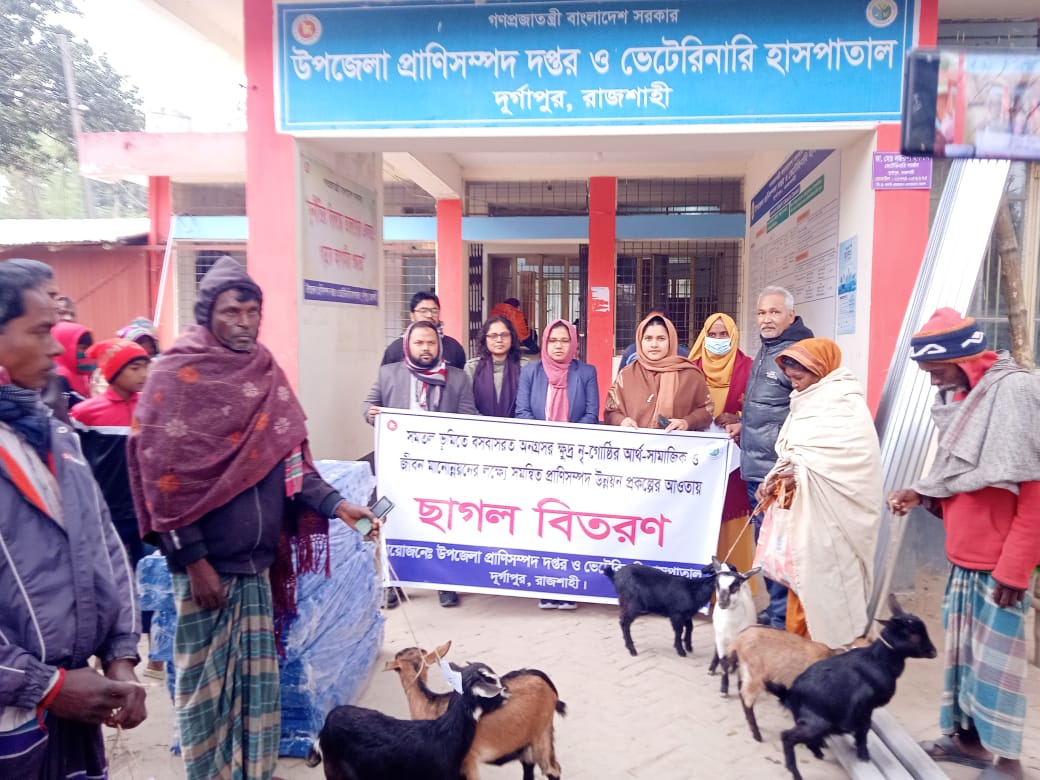 সমতল ভূমিতে বসবাসরত অনগ্রসর ক্ষুদ্র নৃগোষ্ঠীর আর্থ-সামাজিক উন্নয়ন, স্বনির্ভরতা বৃদ্ধি ও জীবনমান উন্নয়নের লক্ষ্যে রাজশাহীর দুর্গাপুরে ২২টি পরিবারের মাঝে ৪৪টি ছাগলসহ বিভিন্ন খামারি উপকরণ বিতরণ করা হয়েছে।