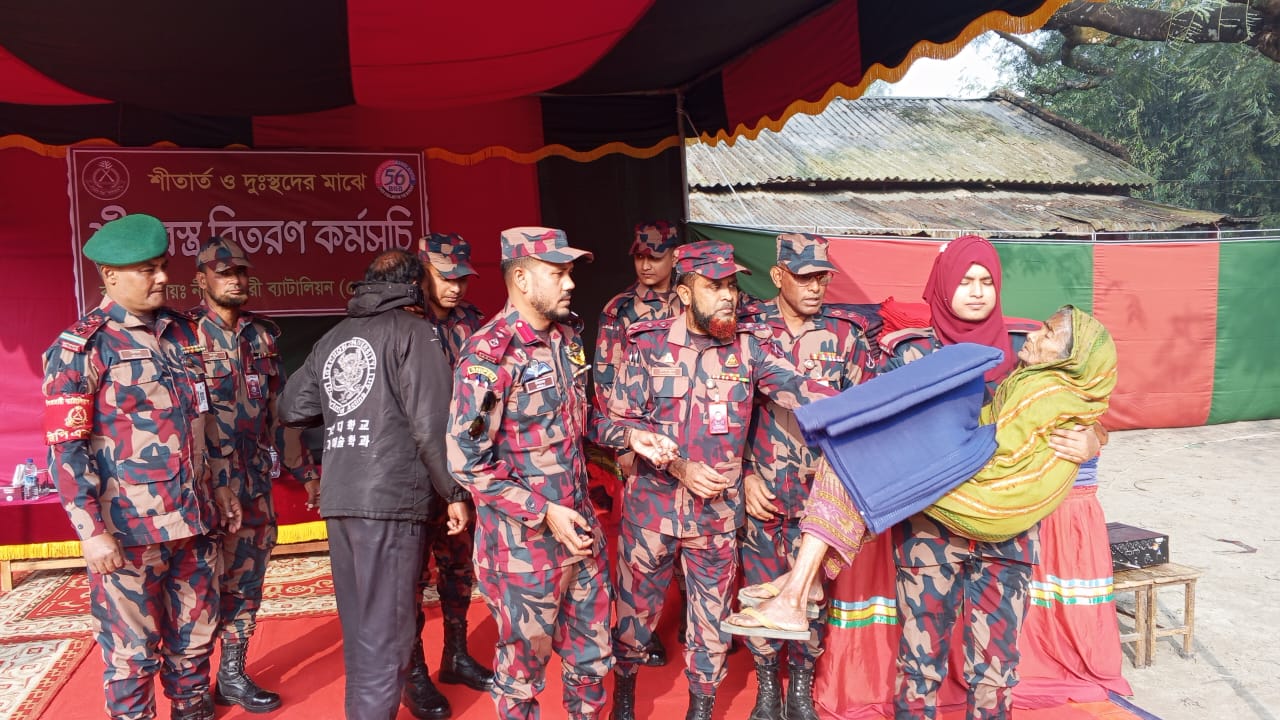 এ সময় প্রধান অতিথি হিসেবে উপস্থিত থেকে নীলফামারী ব্যাটালিয়ন ৫৬ বিজিবি অধিনায়ক লেফটেন্যান্ট কর্নেল মোহাম্মদ সিরাজুল ইসলাম ২৫০ জন দুস্থ ও শীতার্ত মানুষের মাঝে শীতবস্ত্র বিতরণ করেন। বিজিবির সদর দপ্তরের নির্দেশনা অনুযায়ী সমাজের অসহায় ও দরিদ্র মানুষের পাশে দাঁড়ানোর বিজিবীর নৈতিক দায়িত্ব। ভবিষ্যতেও এ ধরনের জনকল্যাণমূলক কার্যক্রম অব্যাহত থাকবে শীতসহ যেকোনো দুর্যোগে বিজিবি সর্বদা সাধারণ মানুষের পাশে থাকবে এছাড়াও বিভিন্ন মিডিয়া ইলেকট্রিক মিডিয়া স্থানীয় গণ্যমান্য ব্যক্তি উপস্থিত ছিলেন।