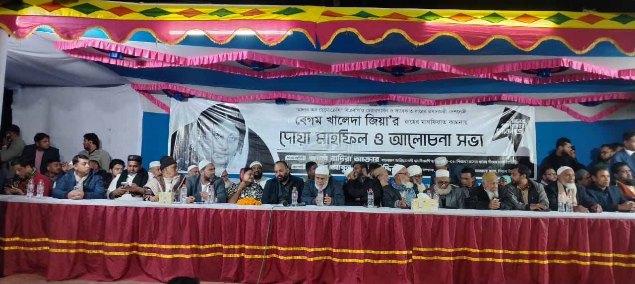 আজ সন্ধ্যায় সাতটায় ঢাকা আবুল বাসার সিদ্দিকীর নিজ বাড়ীতে সাবেক তিনবারের প্রধানমন্ত্রী ও বিএনপি চেয়ারপারসন বেগম খালেদা জিয়া’র রুহের মাগফিরাত কামনায় দোয়া মাহফিল ও আলোচনা সভার আয়োজন করা হয়েছে। অনুষ্ঠানে প্রধান অতিথি হিসেবে উপস্থিত ছিলেন নাদিরা আক্তার,মাদারীপুর-১ (শিবচর) বিএনপি’র ধানের শীষ মার্কার মনোনীত প্রার্থী। সভা পরিচালনা করেন আবুল বাসার সিদ্দিকী, সম্মানিত সদস্য, শিবচর উপজেলা বিএনপি। বক্তারা মরহুমা খালেদা জিয়া’র জন্য দোয়া কামনা করে বলেন তিনি দেশ ও জাতির জীবন্ত ইতিহাস এবং রাজনীতির এক অম্লান স্মৃতি ছিলেন।বেগম খালেদা জিয়া ৩০ ডিসেম্বর, ২০২৫ তারিখে ঢাকা’র ইভারকেয়ার হাসপাতালে দীর্ঘ অসুস্থতার পর মারা যান। মৃত্যুকালে তার বয়স হয়েছিল ৮০ বছর। দেশের প্রথম নারী প্রধানমন্ত্রী হিসেবে তিনবার দায়িত্ব পালন করেন এবং প্রায় চার দশক ধরে বিএনপি’র নেতৃত্বে ছিলেন।অনুষ্ঠানে বক্তারা স্মৃতিচারণ করে বলেন, খালেদা জিয়া শুধু বিএনপি’র নেত্রীই ছিলেন না, তিনি বাংলাদেশের রাজনীতিতে অটুট এক চিহ্ন। তাঁর রাজনৈতিক সংগ্রাম ও ধ্যান-ধারণা দেশ এবং সমাজকে বহু যাত্রায় প্রভাবিত করেছে।