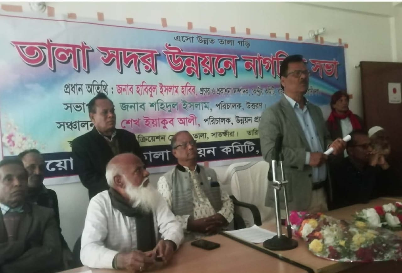 এসো উন্নত তালা গড়ি"এই উদ্দেশ্যকে সামনে রেখে তালা সদর উন্নয়নে নাগরিক সভা অনুষ্টিত হয়েছে। শুক্রবার( ৯ জানুয়ারি ) সকালে তালা উইমেন জব ক্রিয়েশন এর হলরুমে অনুষ্ঠিত নাগরিক সভায় প্রধান অতিথি হিসেবে উপস্থিত ছিলেন সাতক্ষীরা-১(তালা কলারোয়া) সাবেক সংসদ সদস্য মো: হাবিবুল ইসলাম হাবিব। তালা উত্তরণের নির্বাহী পরিচালক মোঃ শহিদুল ইসলাম এর সভাপতিতে ও সাতক্ষীরা উন্নয়ন প্রচেষ্টা পরিচালক শেখ ইয়াকুব আলীর সঞ্চালনায় অতিথি হিসেবে উপস্থিত ছিলেন সাস এর নির্বাহী পরিচালক শেখ ঈমান আলী, উপজেলা বিএনপি'র সাবেক সভাপতি বাবু মৃনাল কান্তি রায়, তালা উপজেলা কমান্ডের সাবেক ডেপুটি কমান্ডার বীর মুক্তিযোদ্ধা আলাউদ্দিন জোয়ার্দার,তালা সরকারি কলেজের সাবেক অধ্যক্ষ আঃ মালেক,উপজেলা বিএনপি'র সাধারণ সম্পাদক (ভারঃ অধ্যক্ষ) শফিকুল ইসলাম, জালালপুর ইউনিয়ন পরিষদ চেয়ারম্যান এম মফিদুল ইসলাম লিটু, শোভাশুনি কলেজের অধ্যক্ষ কামরুল ইসলাম সেলিম, তালা মহিলা কলেজের সাবেক অধ্যক্ষ আঃ রহমান, শালিকা কলেজের অধ্যক্ষ বিধান চন্দ্র সাধু, মহিলা কলেজের সাবেক( ভারঃ অধ্যক্ষ)সাইফুল ইসলাম, উপজেলা বিএনপি'র যুগ্ম সাধারণ সম্পাদক সহঃঅধ্যাপক মোশাররফ হোসেন, তালা উপজেলা যুব দলের আহ্বায়ক মির্জা আতিয়ার রহমান, তালা উপজেলা প্রেসক্লাবের সভাপতি সাংবাদিক মো: আকবর হোসেন, তালা উপজেলা নাগরিক কমিটির সাধারণ সম্পাদক মোঃ শফিকুল ইসলাম, তালা উপজেলা হাজী কল্যাণ ফাউন্ডেশনের সভাপতি সরদার আবুল কাশেম, তালা মুক্তি ফাউন্ডেশন এর নির্বাহী পরিচালক গোবিন্দ কুমার ঘোষ, যুবদল নেতা স ম ইয়াছিন, জাসদের কেন্দ্রীয় নেতা মীর জিল্লুর রহমান,তালা প্রেসক্লাবের সাধারন সম্পাদক ফারুখ জোয়ার্দার সাংগঠনিক সম্পাদক সাংবাদিক জাহাঙ্গীর হোসেন, উন্নয়ন কমিটির সদস্য ও সাংবাদিক এস এম মোতাহিরুল হক শাহিন, বিশিষ্ট ব্যবসায়ী ও সাংবাদিক সরদার আব্দুল্লাহ, সাংবাদিক মিলন গোলদার, ,তালা রিপোটার্স ক্লাবের সাংবাদিক মিজানুর রহমান,সাংবাদিক বাবলুর রহমান, তালা মহিলা কলেজের সহঃ অধ্যাপক আবু হাসান, বিশিষ্ট ব্যবসায়ী হীরক, ভূমিজ এর নির্বাহী পরিচালক ও সহঃঅধ্যাপক অচিন্ত সাহা, শহীদ মুক্তিযোদ্ধা কলেজের সহঃ অধ্যাপক রেজাউল করিম, উইমেন জব ক্রিয়েশন সেন্টারের পরিচালক আশরাফুন্নাহার আাশা, সাংবাদিক সেলিম হায়দার, উন্নয়ন কমিটির সদস্য আলমগীর হোসেন, উন্নয়ন কমিটির সদস্য রেজাউল ইসলাম, বিশিষ্ট ব্যবসায়ী খন্দকার মোয়াজ্জেম হোসেন, ডাঃ জাকির হোসেন প্রমুখ।অনুষ্ঠানে ভিডিও প্রজেক্টের মাধ্যমে অনুষ্ঠানের কার্যক্রম উপস্থাপন করেন সাংবাদিক ও প্রধান শিক্ষক গাজী জাহিদুর রহমান ও উত্তরণের দিলিপ সানা।প্রধান অতিথির বক্তব্যে সাবেক সংসদ হাবিবুল ইসলাম হাবিব বলেন, তালার উন্নয়নে আম