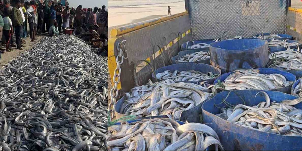 টেকনাফে জেলেদের টানা জালে ধরা পড়ল ১০৮ মণ ছুরি মাছ।