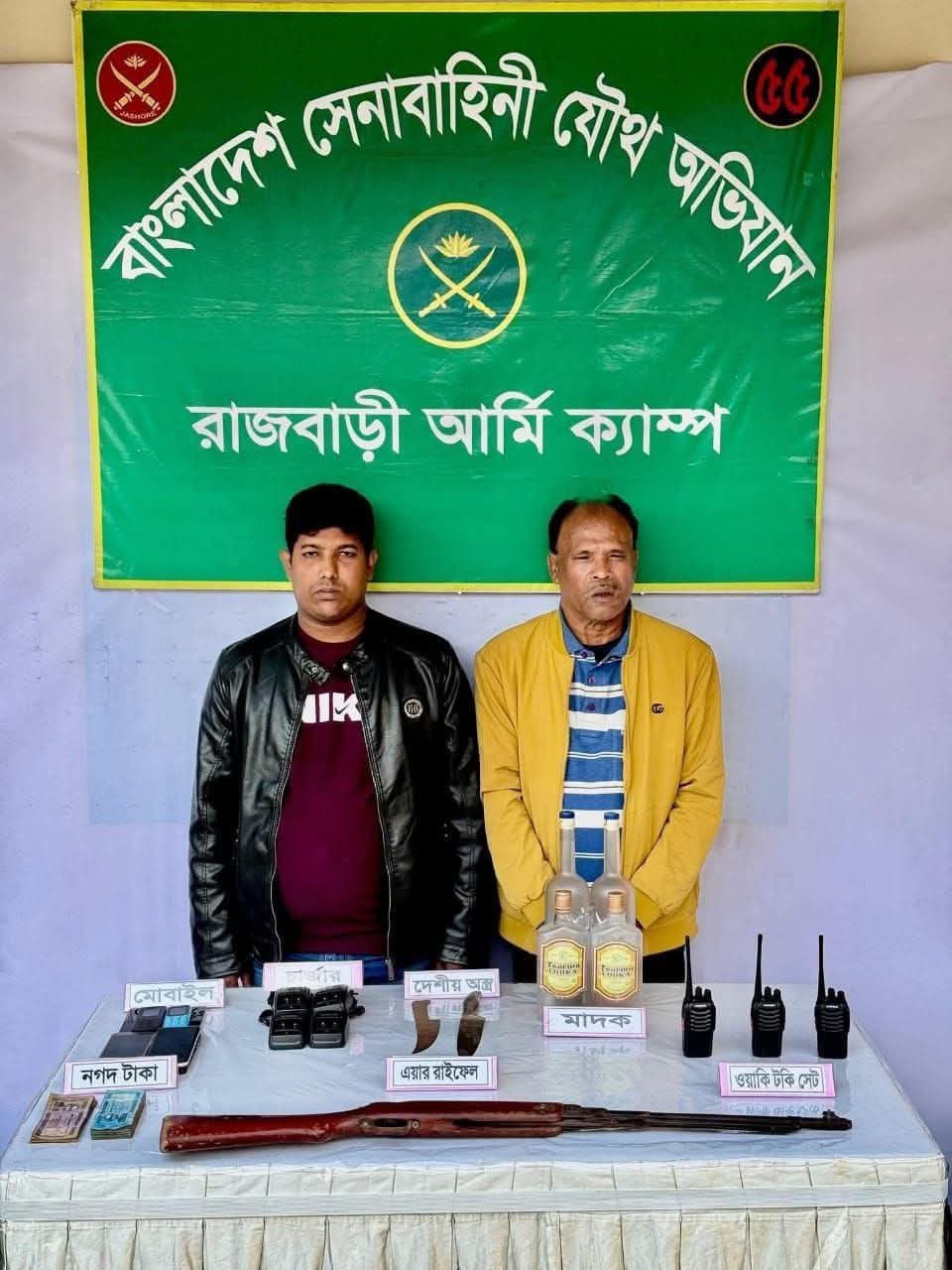 রাজবাড়ীর বালিয়াকান্দিতে অস্ত্র, মদ, নগদ অর্থ ও ওয়াকি-টকিসহ বিএনপির সাবেক নেতা ও এক সহযোগীকে গ্রেফতার করেছে সেনাবাহিনী।শনিবার (১১ জানুয়ারি) সন্ধ্যায় গ্রেফতারের বিষয়টি নিশ্চিত করেন বালিয়াকান্দি থানার ভারপ্রাপ্ত কর্মকর্তা (ওসি)মোঃ আব্দুর রব তালুকদার।