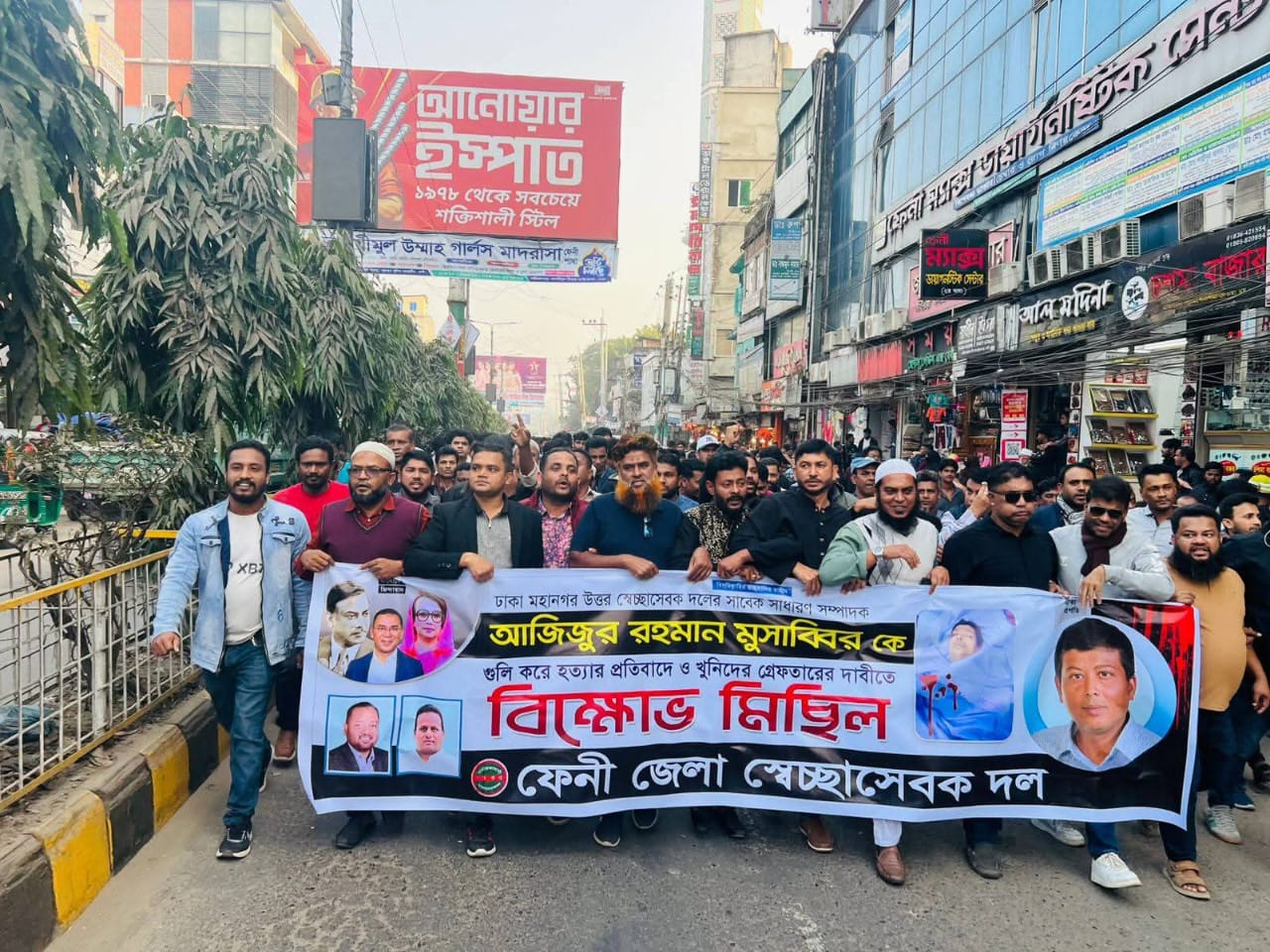 ঢাকা মহানগর উত্তর স্বেচ্ছাসেবক দলের সাবেক সাধারণ সম্পাদক আজিজুর রহমান মুসাব্বিরকে গুলি করে নির্মমভাবে হত্যার প্রতিবাদে এবং হত্যাকারীদের দ্রুত গ্রেফতারের দাবিতে ফেনীতে বিক্ষোভ মিছিল করেছে জেলা স্বেচ্ছাসেবক দল।শনিবার (১০ জানুয়ারি) বিকালে ফেনী শহরের ভাষা শহীদ সালাম কমিউনিটি সেন্টারের সামনে থেকে বিক্ষোভ মিছিলটি শুরু হয়ে শহরের গুরুত্বপূর্ণ সড়ক ট্রাংক রোড প্রদক্ষিণ করে। মিছিলে বিপুল সংখ্যক নেতাকর্মী অংশগ্রহণ করেন।এ সময় নেতাকর্মীরা হত্যাকাণ্ডের তীব্র নিন্দা জানিয়ে বিভিন্ন স্লোগান দেন এবং অবিলম্বে খুনিদের গ্রেফতারের দাবি জানান।জেলা স্বেচ্ছাসেবক দলের সভাপতি সাইদুর রহমান জুয়েল ও সাধারণ সম্পাদক এসএম কায়সার এলিনের নেতৃত্বে অনুষ্ঠিত বিক্ষোভ মিছিলের অগ্রভাগে উপস্থিত ছিলেন জেলা স্বেচ্ছাসেবক দলের সাংগঠনিক সম্পাদক হাসান মাহমুদ সবুজ, সহ-সভাপতি জাহিদুল ইসলাম শিমুল, সিনিয়র যুগ্ম সম্পাদক দেলোয়ার হোসেন দোলন, যুগ্ম সম্পাদক রাকিবুল হক, কামরুজ্জামান সুমন, সহ-সাধারণ সম্পাদক আমির হোসেন দুলাল, দপ্তর সম্পাদক খুরশিদ রহমান সূর্য, প্রচার সম্পাদক আলাউদ্দিন ও অর্থ সম্পাদক আবদুল হাই ছুট্টু।এছাড়াও উপস্থিত ছিলেন সাহিত্য ও প্রকাশনা সম্পাদক মঞ্জুর মোরশেদ পিন্টু, সমাজ কল্যাণ বিষয়ক সম্পাদক মামুন খান, সদর উপজেলা স্বেচ্ছাসেবক দলের আহবায়ক যোবায়ের হোসেন ও সদস্য সচিব বেলাল হোসেন, সিনিয়র যুগ্ম আহবায়ক খুরশিদ আলম, ফেনী পৌর স্বেচ্ছাসেবক দলের আহবায়ক মজিবুর রহমান ও সদস্য সচিব ইকবাল হোসেন।বিক্ষোভ মিছিলে আরও অংশ নেন সিনিয়র যুগ্ম আহবায়ক বদরুদ্দোজা চাঁন মিয়া, যুগ্ম আহবায়ক মিশকাতুর রহমান মামুন, মাসুদ হাসান জুয়েল, সাইফুল ইসলাম, দাগনভূঞা উপজেলা স্বেচ্ছাসেবক দলের আহবায়ক আবদুল্লাহ আল মামুন ও সদস্য সচিব জহিরুল ইসলাম মঞ্জুসহ জেলা ও উপজেলার বিভিন্ন পর্যায়ের নেতাকর্মীরা।নেতৃবৃন্দ তাদের বক্তব্যে বলেন, আজিজুর রহমান মুসাব্বির ছিলেন একজন ত্যাগী ও জনপ্রিয় নেতা। তাকে পরিকল্পিতভাবে হত্যা করা হয়েছে। এই হত্যাকাণ্ডের সঙ্গে জড়িতদের দ্রুত আইনের আওতায় এনে দৃষ্টান্তমূলক শাস্তি নিশ্চিত না হলে কঠোর আন্দোলনের হুঁশিয়ারি দেন তারা।বিক্ষোভ মিছিল শেষে শান্তিপূর্ণভাবে কর্মসূচির সমাপ্তি ঘোষণা করা হয়।আপনি চাইলে আমি এটিকে আরও আক্রমণাত্মক রাজনৈতিক ভাষায়,অথবা সংক্ষিপ্ত ভার্সন,কিংবা অনলাইন পোর্টাল উপযোগী SEO নিউজ ফরম্যাটে আবার সাজিয়ে দিতে পারি।