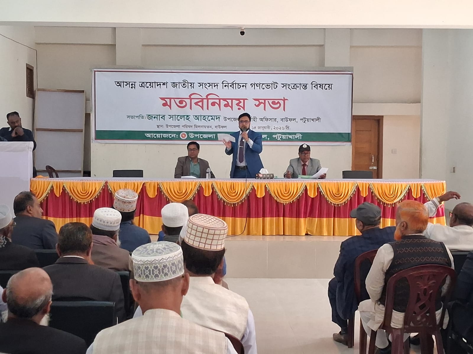 পটুয়াখালী বাউফল উপজেলায় আসন্ন গণভোটকে সামনে রেখে উপজেলার সকল প্রাথমিক, মাধ্যমিক বিদ্যালয়, মাদ্রাসা ও কলেজের প্রতিষ্ঠান প্রধানদের সঙ্গে এক মতবিনিময় ও অবহিতকরণ সভা অনুষ্ঠিত হয়েছে। একই সঙ্গে গণভোটের গুরুত্ব ও প্রক্রিয়া সম্পর্কে সচেতনতা বাড়াতে লিফলেট বিতরণ করা হয়।সভায় সভাপতিত্ব করেন বাউফল উপজেলা নির্বাহী অফিসার (ইউএনও) ও সহকারী রিটার্নিং অফিসার সালেহ আহমেদ। তিনি বলেন, গণভোট একটি গুরুত্বপূর্ণ গণতান্ত্রিক প্রক্রিয়া।শিক্ষাপ্রতিষ্ঠান প্রধানরা সমাজে সচেতন নাগরিক তৈরিতে অগ্রণী ভূমিকা পালন করেন। তাই সঠিক তথ্য শিক্ষার্থী ও অভিভাবকদের মাঝে পৌঁছে দিতে তাদের সহযোগিতা অত্যন্ত জরুরি।সভায় গণভোটের উদ্দেশ্য, ভোট প্রদানের পদ্ধতি, ভোটারদের অধিকার ও দায়িত্বসহ বিভিন্ন বিষয় বিস্তারিতভাবে তুলে ধরা হয়। পাশাপাশি অবাধ, সুষ্ঠু ও শান্তিপূর্ণভাবে গণভোট সম্পন্ন করতে সকলের সম্মিলিত সহযোগিতা কামনা করা হয়।অনুষ্ঠানে উপস্থিত প্রতিষ্ঠান প্রধানরা গণভোট বিষয়ে সরকার নির্ধারিত নির্দেশনা মেনে শিক্ষার্থী ও সাধারণ মানুষের মাঝে সচেতনতা বৃদ্ধিতে ভূমিকা রাখার অঙ্গীকার ব্যক্ত করেন।