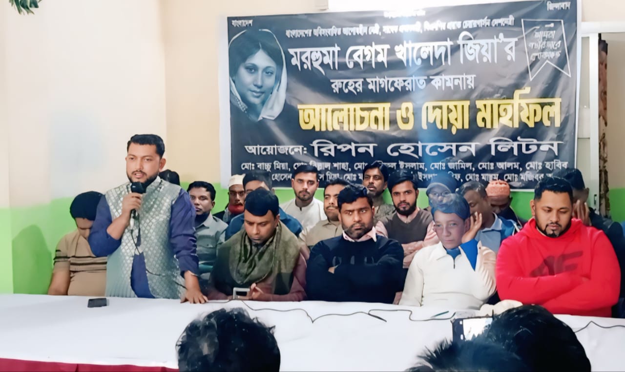 বুধবার (১৪ ই জানুয়ারী ২০২৫ ইং) রাতে ৪৫ নং ওয়ার্ড যুবদল নেতা রিপন হোসেন লিটনের আয়োজনে আলোচনা সভা ও দোয়া মাহফিল অনুষ্ঠিত হয়। উক্ত দোয়া মাহফিলে টঙ্গী পূর্ব থানা যুবদল নেতা মোঃ জুয়েল রহমানের সভাপতিত্ব এবং ৪৫ নং ওয়ার্ড যুবদল নেতা আব্দুস সাত্তার এর সঞ্চালনায় প্রধান অতিথি হিসেবে উপস্থিত ছিলেন মোঃ সাইফুর রহমান শাহিন। অনুষ্ঠানে বিশেষ অতিথি হিসাবে উপস্থিত ছিলেন কারারুদ্ধ নির্যাতিত টঙ্গী পূর্ব থানা যুবদল নেতা মোঃ সোহেল রানা শুভ্র, ৪৫ নং ওয়ার্ড যুবদল নেতা মোঃ মনির হোসেন, ৫৬ নং ওয়ার্ড যুবদলের সভাপতি মোঃ আবুল হোসেন, ৫৬ নং ওয়ার্ড যুবদলের সাংগঠনিক সম্পাদক মোঃ শওকত হোসেন। এছাড়াও উপস্থিত ছিলেন ৪৫ নং ওয়ার্ড যুবদল নেতা, তুষার মল্লিক, মোঃ সালাউদ্দিন, মোঃ তুষার আহমেদ, মোঃ নাজমুল হুদা সহ বিএনপির অঙ্গ সহযোগী সংগঠনের বিভিন্ন পযার্য়ের নেতৃবেন্দ উপস্থিত ছিলেন।অনুষ্ঠানে সার্বিক সহযোগিতায় ছিলেন বিএনপির একনিষ্ঠ কর্মী মোঃ বিল্লাল শাহ্, মোঃ মুজিবুর রহমান, মোঃ শরিফুল ইসলাম শরিফ, মোঃ জামিল, মোঃ বাচ্চু মিয়া, মোঃ আলম, মোঃ রইচ মিয়া, মোঃ মনির, মোঃ মাসুম প্রমূখ। আলোচনা সভা শেষে বিএনপির চেয়ারপারসন সাবেক প্রধানমন্ত্রী মরহুমা বেগম খালেদা জিয়া'র রুহের মাগফেরাত কামনায় বিশেষ দোয়া করা হয় এবং দোয়া শেষে উপস্থিত সকলের মাঝে তবারক বিতরণ করা হয়।