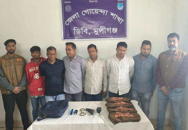মুন্সীগঞ্জের লৌহজং উপজেলায় আইনশৃঙ্খলা বাহিনীর সদস্য পরিচয়ে ঢাকা–মাওয়া এক্সপ্রেসওয়েতে ডাকাতির প্রস্তুতিকালে ছয়জনকে গ্রেপ্তার করেছে জেলা গোয়েন্দা পুলিশ (ডিবি)।শনিবার দুপুরে পদ্মা সেতু (উত্তর) থানাধীন মাওয়া টোল প্লাজা এলাকা থেকে তাদের আটক করা হয়।গ্রেপ্তাররা হলেন মো. বশির হাওলাদার (৫৬), মো.কাজল ইসলাম,জিকু(৩০),মো.হীরাবেপারী(৪৮),মো:মোস্তাফিজুর রহমান রাজু (৪৮),মো.রুবেল রানা (৩০) ও মো.ফয়সাল রাব্বি (২১)।ডিবি পুলিশ জানায়, গোপন সংবাদের ভিত্তিতে শনিবার দুপুর ১২টার দিকে মাওয়া টোল প্লাজা এলাকায় চেকপোস্ট বসানো হয়।এ সময় একটি সিলভার রঙের হাইয়েচ মাইক্রোবাস থামাতে গেলে ভেতরে থাকা কয়েকজন নিজেদের আইনশৃঙ্খলা বাহিনীর সদস্য পরিচয় দিয়ে পালানোর চেষ্টা করে।তাদের আচরণ সন্দেহজনক হওয়ায় গাড়িসহ সবাইকে আটক করে পুলিশ।জিজ্ঞাসাবাদে জানা যায়,গ্রেপ্তারদের মধ্যে একজন চাকরিচ্যুত পুলিশ সদস্য,একজন বরখাস্তকৃত পুলিশ সদস্য এবং একজন চাকরিচ্যুত সেনা সদস্য রয়েছেন।তাদের বিরুদ্ধে এর আগেও একই ধরনের অপরাধে একাধিক মামলা রয়েছে বলে জানিয়েছে পুলিশ।অভিযানে গ্রেপ্তারদের কাছ থেকে একটি হাইয়েচ মাইক্রোবাস,একটি ওয়াকিটকি, একটি খেলনা পিস্তল, একটি হ্যান্ডকাপ,ডিবি পুলিশের পোশাক,একটি ইলেকট্রিক শক মেশিন ও একটি লেজার লাইট উদ্ধার করা হয়।পুলিশের ধারণা,এসব সরঞ্জাম ব্যবহার করে তারা মহাসড়কে চলাচলকারী যানবাহনের যাত্রীদের ভয় দেখিয়ে ডাকাতি ও ছিনতাইয়ের প্রস্তুতি নিচ্ছিল।এ ঘটনায় পদ্মা সেতু (উত্তর) থানায় দণ্ডবিধির ১৭০, ১৭১, ৩৯৯ ও ৪০২ ধারায় একটি মামলা দায়ের করা হয়েছে।গ্রেপ্তারদের আদালতে পাঠানোর প্রক্রিয়া চলছে।পুলিশ জানায়, এই চক্রের সঙ্গে জড়িত অন্য সদস্যদের শনাক্ত ও গ্রেপ্তারে তদন্ত অব্যাহত রয়েছে।