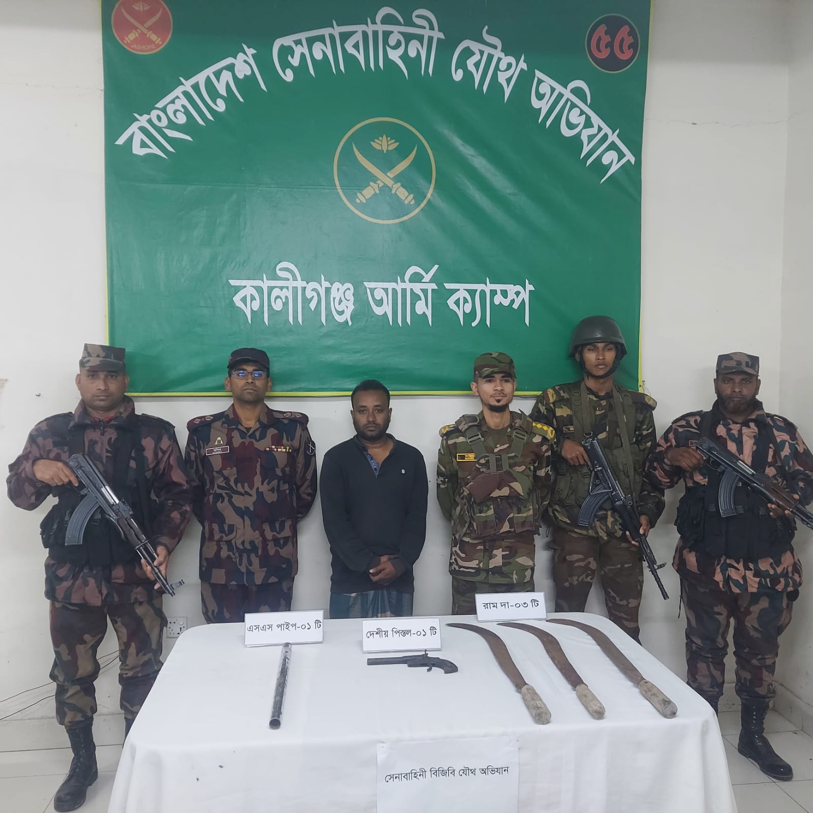সাতক্ষীরা জেলার শ্যামনগর উপজেলায় কৈখালী ইউনিয়নে নিদয়া গ্রামে যৌথবাহিনী (সেনাবাহিনী ও বিজিবি) কর্তৃক অস্ত্র উদ্ধার অভিযান করা হয়েছে।২৬ জানুয়ারি সোমবার দিবাগত রাতে গোপন সংবাদের ভিত্তিতে, শ্যামনগর উপজেলার নিদয়া গ্রামের মো: হাবিবুর রহমান নামক একজন সন্ত্রাসী আগ্নেয়াস্ত্র এবং দেশীয় অস্ত্রসহ নিজ বাসায় অবস্থান করছে। উক্ত তথ্যের ভিত্তিতে কালিগঞ্জ সেনা ক্যাম্প এবং ১৭ বিজিবির সম্মিলিত প্রচেষ্টায় সোমবার দিবাগত রাত ০২:৩০ ঘটিকায় বর্ণিত সন্ত্রাসীর নিজ বাসস্থানে একটি যৌথ অভিযান পরিচালনা করা হয়। উক্ত অভিযানে যৌথবাহিনী হাতেনাতে এক জনকে আটক করতে সক্ষম হয়। অভিযানে উক্ত সন্ত্রাসীর নিজ বাসস্থানের সামনে রাখা ধানের গোলার ভিতর থেকে একটি দেশীয় আগ্নেয়াস্ত্র এবং বাসস্থানের ভেতর থেকে বিভিন্ন দেশীয় ধারালো অস্ত্র উদ্ধার করা হয়। আটককৃত আসামী মো: হাবিবুর রহমান পিতা: লিয়াকত হোসেন গ্রাম: নিদয়া, পোস্ট অফিসঃ আজাদনগর, থানাঃ শ্যামনগর, জেলাঃ সাতক্ষীরা জব্দকৃত মালামালের বিবরণঃ ১. দেশীয় আগ্নেয়াস্ত্র ০১ টি, ২. রামদা ০৩ টি, ৩. এস এস পাইপ ১ টি