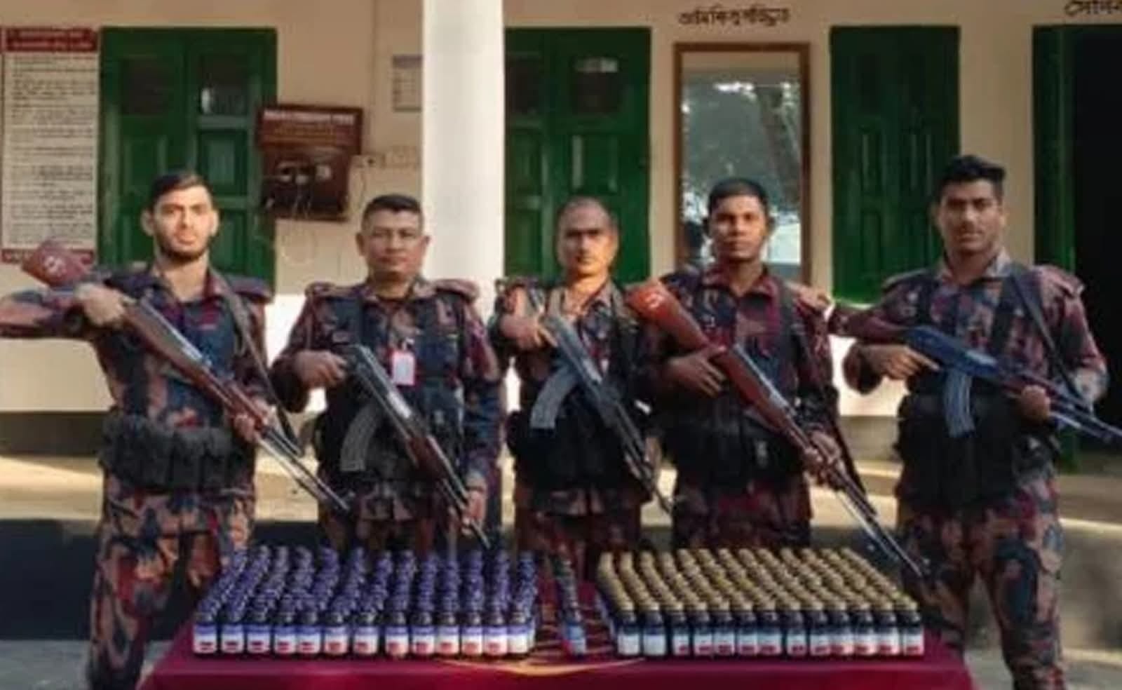 যশোর সীমান্তে অভিযান পরিচালনা করে মালিকবিহীন মাদকদ্রব্য আটক করেছে বর্ডার গার্ড বাংলাদেশ বিজিবি সদস্যরা।শনিবার ( ১৪ ফেব্রুয়ারি ২০২৬) দিনব্যাপী বিজিবি এর বিশেষ টহলদল, শাহজাদপুর বিওপি’র সীমান্ত এলাকায় মাদক বিরোধী অভিযান পরিচালনা করে ফেন্সিডিল, WINCEREX COUGH SYRUP এবং Eskuf Syrup আটক করে। আটককৃত মালামালের মূল্য ১,২৮,৮০০/- (এক লক্ষ আঠাশ হাজার আটশত) টাকা।যশোর ৪৯ বিজিবি ব্যাটালিয়নের অধিনায়ক লেঃ কর্নেল সাইফুল্লাহ্ সিদ্দিকী জানান, দীর্ঘদিন যাবত মাদকদ্রব্য ও চোরাচালানী মালামালসহ পাচার চক্র আটকের নিমিত্তে সীমান্ত এলাকায় বিজিবি’র বিশেষ পরিকল্পনা অনুযায়ী গোয়েন্দা তৎপরতা ও অভিযান কার্যক্রম অব্যাহত রয়েছে। এরই ধারাবাহিকতায় যশোর ব্যাটালিয়নের দায়িত্বপূর্ণ সীমান্তবর্তী এলাকায় নিয়মিতভাবে অভিযান পরিচালনা করে মাদকদ্রব্য এবং বিভিন্ন ধরনের চোরাচালানী মালামাল জব্দ করতে সক্ষম হচ্ছে। সীমান্তে বিজিবির এ ধরনের অভিযান কার্যক্রম সবসময়ই অব্যাহত থাকবে বলে জানান বিজিবি কর্মকর্তা।