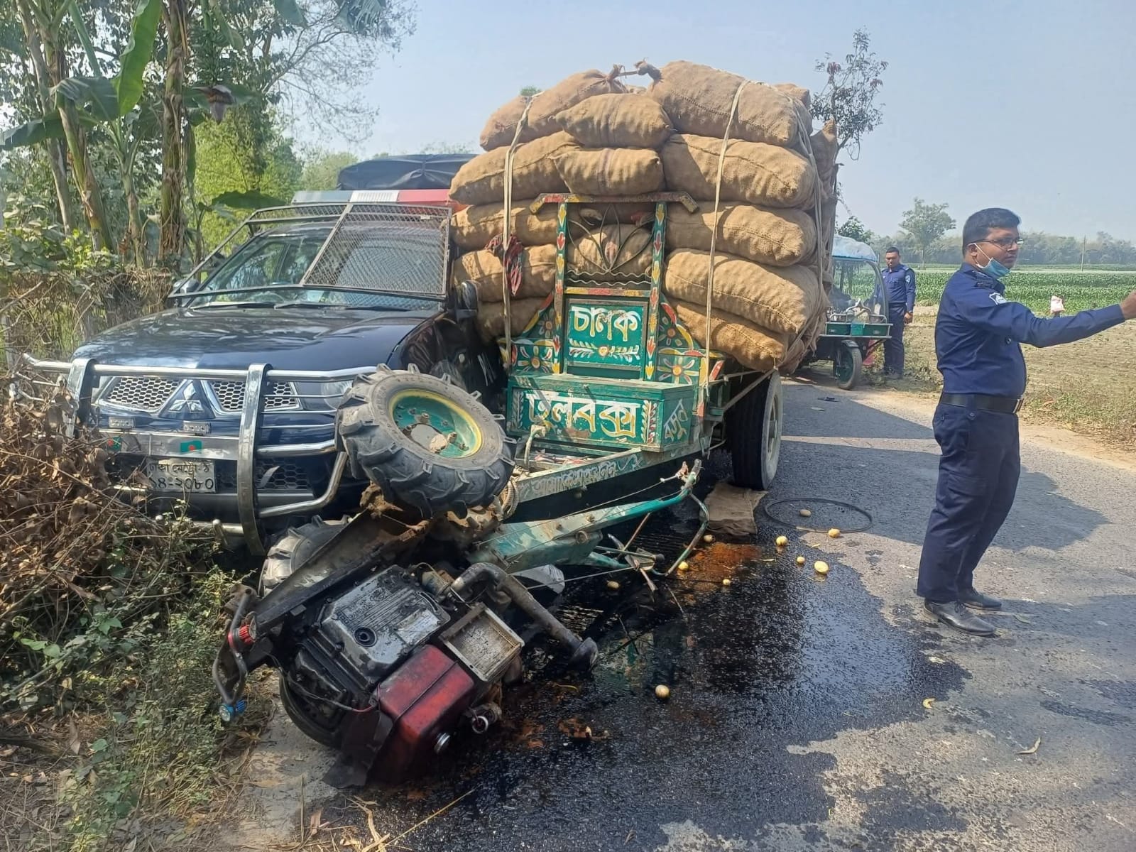 ঠাকুরগাঁও- বালিয়াডাঙ্গীর জোতপারার ঢোরামারা পুকুর সংলগ্ন পাকা রাস্তায় আলু বোঝাই পাওয়ার ট্রিলার নিয়ন্ত্রণ হারিয়ে হরিপুর থানা পুলিশের একটি পিকাপ ভ্যানের সাথে সংঘর্ষ হয়। এতে পুলিশের পিকাপ ভ্যানটি রাস্তার ধারে পরে যায়।