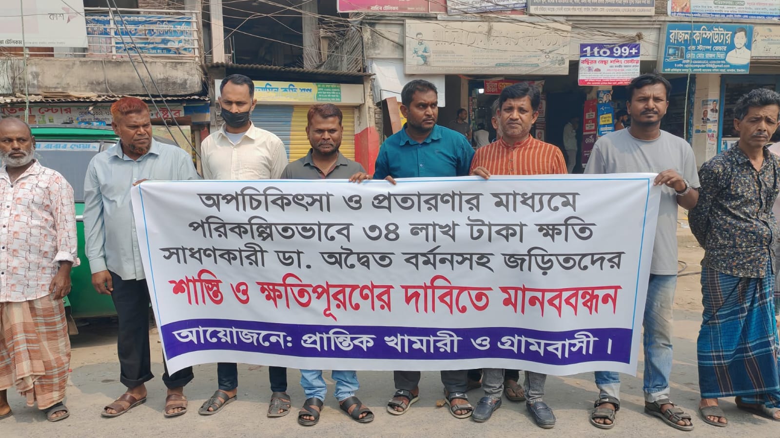 মানবন্ধনে রেনেটা ফার্মার নিজস্ব ভেটেরিনারি চিকিৎসক অদ্বৈত বর্মন ও অপসোনিন ফার্মার নিজস্ব চিকিৎসক মেহেদী হাসানসহ জড়িতরা প্রতারণা মাধ্যমে ক্ষতি সাধন করায় তাদের শাস্তি ও ক্ষতিপূরণের দাবি জানানো হয়।