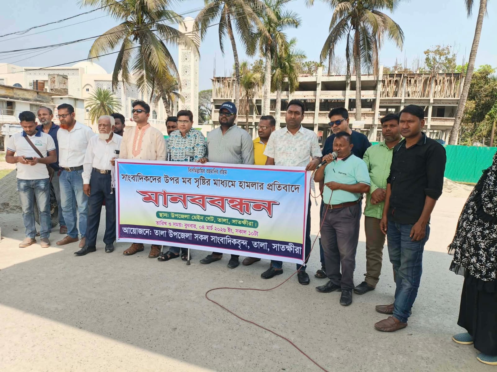 সাতক্ষীরার সাংবাদিকদের উপরে মব সৃষ্টি করে নির্যাতনের প্রতিবাদে দোষীদের শাস্তির দাবিতে মানববন্ধন অনুষ্ঠিত হয়েছে। বুধবার ৪ঠা মার্চ সকাল ১০ ঘটিকার সময় তালা উপজেলা প্রধান ফটকের সামনে উপজেলায় কর্মরত সাংবাদিকদের সকল ইউনিটের সম্মিলিত আয়োজনে এ মানববন্ধন অনুষ্ঠিত হয়। তালা প্রেসক্লাবের একাংশের সভাপতি এম এ হাকিমের সভাপতিত্বে ও দৈনিক মানবকন্ঠ, ডেইলি ভয়েজ অফ এশিয়ার তালা উপজেলা প্রতিনিধি ও তালা উপজেলা প্রেসক্লাবের সভাপতি সাংবাদিক আকবর হোসেনের সঞ্চালনায় উক্ত মানববন্ধনে বক্তব্য রাখেন উপজেলা প্রেসক্লাবের সহ সভাপতি সাইদুর রহমান সাঈদ, যুগ্ন সাধারণ সম্পাদক শাহিন আলম,সহ-সাংগঠনিক সম্পাদক গোলাম রাব্বানী, সহ-সাংগঠনিক আতাউর রহমান, দপ্তর সম্পাদক হাফিজুর রহমান, কোষাধক্ষ্য এইচ এম মুফতি এনামুল হক, উপজেলা প্রেসক্লাবের সদস্য সাংবাদিক জহর হাসান সাগর । সাংবাদিক সাঈদ সম্রাট, তালা প্রেসক্লাবের সাধারণ সম্পাদক ফারুক জোয়াদ্দার , সহ-সভাপতি এম এ ফয়সাল, সাংগঠনিক সম্পাদক জাহাঙ্গীর হোসেন, সাংবাদিক জি এম খলিলুর রহমান লিতু, সাংবাদিক লিয়াকত হোসেন, শেখ ইমরান হোসেন, সাংবাদিক শেখ মখফুর রহমান জান্টু, আব্দুল মতিন, সাতক্ষীরা প্রেসক্লাবের সদস্য সানজিদুল হক ইমন, নাজমুল হাসান মাহি, প্রমুখ। বক্তারা তাদের বক্তব্যের সম্প্রতি শ্যামনগর উপজেলা প্রেসক্লাবের সভাপতি সামিউল মনিরের উপর ্সন্ত্রাসী হামলা ও পাটকেলঘাটায় দুইজন সাংবাদিকের উপর মব সৃষ্টি করে হামলা সহ চারজন সাংবাদিকের নির্যাতন ও মিথ্যা চাঁদাবাজির মামলা দিয়ে ফাঁসানোর তীব্র নিন্দা ও দোষীদের শাস্তির দাবি জানান। সম্প্রতি ঢাকা থেকে প্রকাশিত দৈনিক সমকাল পত্রিকার শ্যামনগর উপজেলা প্রতিনিধি ও শ্যামনগর উপজেলা প্রেসক্লাবের সভাপতি সামিউল মনির "যুবলীগ, যুবদল ও যুব জামাত মিলে বালুমহাল লুট "" শীর্ষক সংবাদ প্রকাশ করায় সন্ত্রাসী হামলার শিকার হয়। তাছাড়া সম্প্রতি পাটকেলঘাটা জোড়া টাওয়ার রোডে ১/১ খতিয়ানের সরকারি সম্পত্তি ১৮ লক্ষ টাকায় হস্তান্তরের তথ্য আনতে গেলে