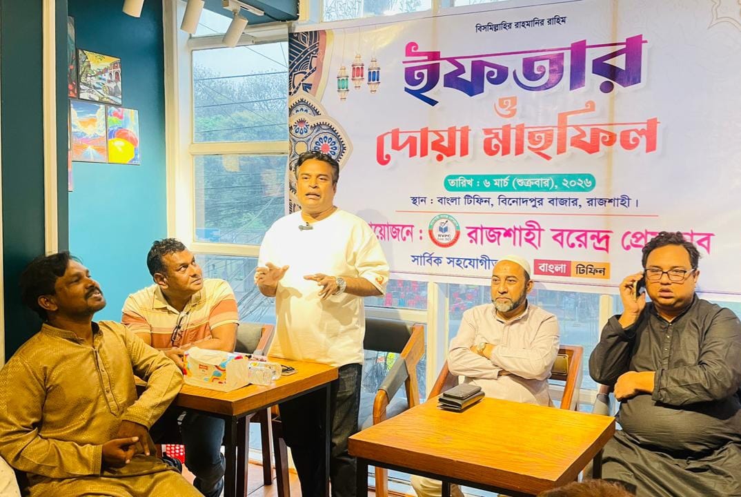 পবিত্র মাহে রমজান উপলক্ষে রাজশাহীতে বরেন্দ্র প্রেসক্লাবের উদ্যোগে এক ইফতার ও দোয়া মাহফিল অনুষ্ঠিত হয়েছে। শুক্রবার (৬ মার্চ) বিকেলে নগরীর বাংলা টিফিন রেস্তোরাঁয় এ আয়োজন করা হয়। এতে স্থানীয় বিভিন্ন গণমাধ্যমের সাংবাদিক, সামাজিক ও রাজনৈতিক ব্যক্তিত্বরা অংশ নেন।ইফতারের পূর্বে অনুষ্ঠিত সংক্ষিপ্ত আলোচনা সভায় বক্তারা পেশাদার সাংবাদিকতা, বস্তুনিষ্ঠ সংবাদ পরিবেশন এবং নৈতিকতা বজায় রাখার ওপর গুরুত্বারোপ করেন। তারা বলেন, সাংবাদিকরা সমাজের আয়না হিসেবে কাজ করেন এবং সত্য তুলে ধরার দায়িত্ব তাদের ওপর ন্যস্ত। যেকোনো প্রতিকূলতা উপেক্ষা করে সত্য ও নিরপেক্ষতার ভিত্তিতে সংবাদ পরিবেশন করাই একজন সাংবাদিকের প্রধান দায়িত্ব।