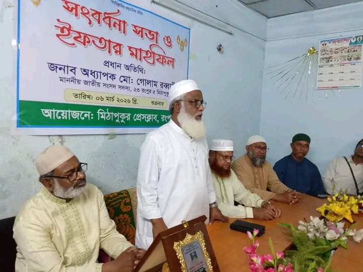 মিঠাপুকুর প্রেসক্লাবের আয়োজনে নবনির্বাচিত সংসদ সদস্যকে সংবর্ধনা প্রদান ও দোয়া ও ইফতার মাহফিল অনুষ্ঠিত হয়েছে। শুক্রবার স্থানীয় একটি মিলনায়তনে এই অনুষ্ঠানের আয়োজন করা হয়।