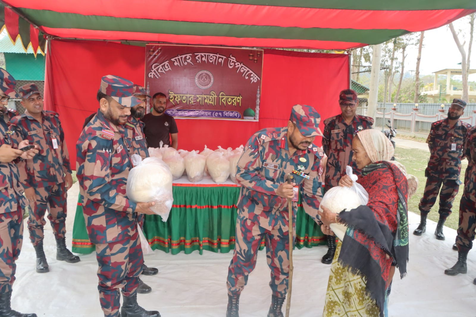পবিত্র মাহে রমজান উপলক্ষে বান্দরবানের আলীকদমে দুঃস্থ ও অসহায় মানুষের মাঝে ইফতার সামগ্রী বিতরণ এবং এতিমখানায় আর্থিক অনুদান প্রদান করেছে Border Guard Bangladesh (বিজিবি)। সোমবার (৯ মার্চ) কক্সবাজার রিজিয়নের অধীন বান্দরবান সেক্টরের আওতাধীন Border Guard Bangladesh এর আলীকদম ব্যাটালিয়ন (৫৭ বিজিবি) এর উদ্যোগে উপজেলার নয়াপাড়া ইউনিয়নে বসবাসরত স্থানীয় দুঃস্থ ও অসহায় ১০০টি পরিবারের মাঝে ইফতার সামগ্রী বিতরণ করা হয়। অনুষ্ঠানে প্রধান অতিথি হিসেবে উপস্থিত থেকে ইফতার সামগ্রী বিতরণ করেন আলীকদম ব্যাটালিয়ন (৫৭ বিজিবি) এর অধিনায়ক লেঃ কর্ণেল আব্দুল্লাহ আল মেহেদী, পদাতিক। এ সময় তিনি আলীকদম উপজেলার দুটি মাদ্রাসা ও এতিমখানার শিক্ষার্থীদের জন্য আর্থিক অনুদান প্রদান করেন। প্রতিষ্ঠান দুটি হলো—আলীকদম আজিজিয়া ফয়জুল উলুম মাদ্রাসা ও এতিমখানা এবং আলীকদম ইসলামিয়া এতিমখানা। মাহে রমজানে এতিম শিক্ষার্থীদের জন্য উন্নতমানের ইফতার ও সেহরির ব্যবস্থা নিশ্চিত করতে এ অনুদান প্রদান করা হয়।