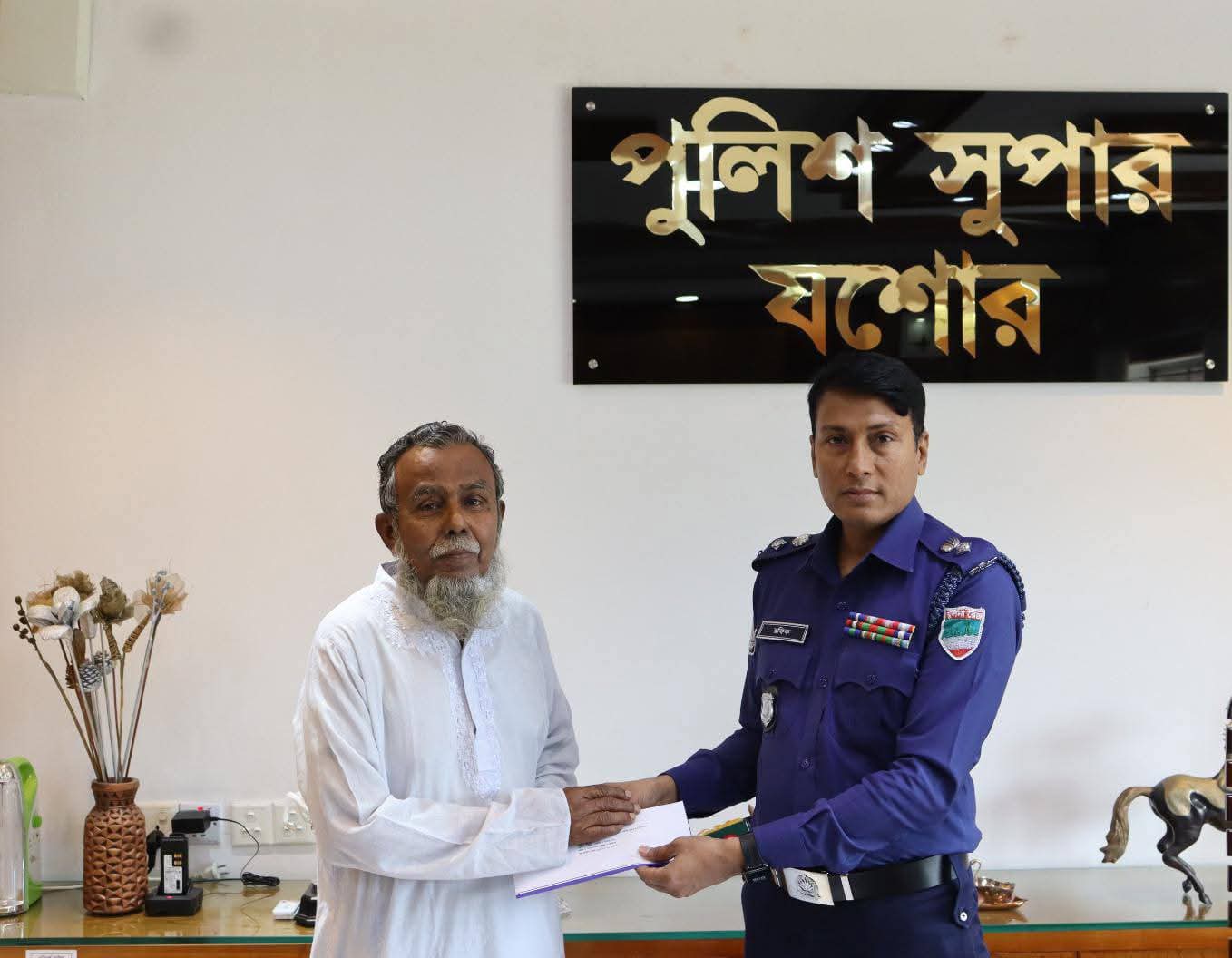 কর্তব্যের তরে করে গেল যারা, আত্মবলিদান প্রতিক্ষণে স্মরি, রাখিব ধরি তোমাদের সম্মান”এই প্রতিশ্রুতি বুকে ধারণ করে বাংলাদেশ পুলিশের সম্মানিত ইন্সপেক্টর জেনারেল (আইজিপি) জনাব মোঃ আলী হোসেন ফকির মহোদয়ের পক্ষ থেকে পবিত্র ঈদুল ফিতর-২০২৬ উপলক্ষে কর্তব্যরত অবস্থায় জীবন উৎসর্গকারী দেশপ্রেমিক পুলিশ সদস্যদের পরিবারবর্গকে ঈদ শুভেচ্ছা বার্তাসহ উপহার সামগ্রী প্রদান করা হয়েছে। ইং- ১১/০৩/২০২৬ খ্রিঃ তারিখ বেলা ১২:০০ ঘটিকায় পুলিশ সুপারের কার্যালয়ের অফিস কক্ষে ইন্সপেক্টর জেনারেল (আইজিপি) মহোদয় কর্তৃক প্রেরিত পবিত্র ঈদুল ফিতর-২০২৬ এর শুভেচ্ছা বার্তাসহ উপহার সামগ্রী যশোর জেলার কর্তব্যরত অবস্থায় জীবন উৎসর্গকারী ০৪ জন পুলিশ সদস্যদের পরিবারবর্গের নিকট আনুষ্ঠানিকভাবে হস্তান্তর করেন জনাব সৈয়দ রফিকুল ইসলাম পিপিএম সেবা মহোদয়।