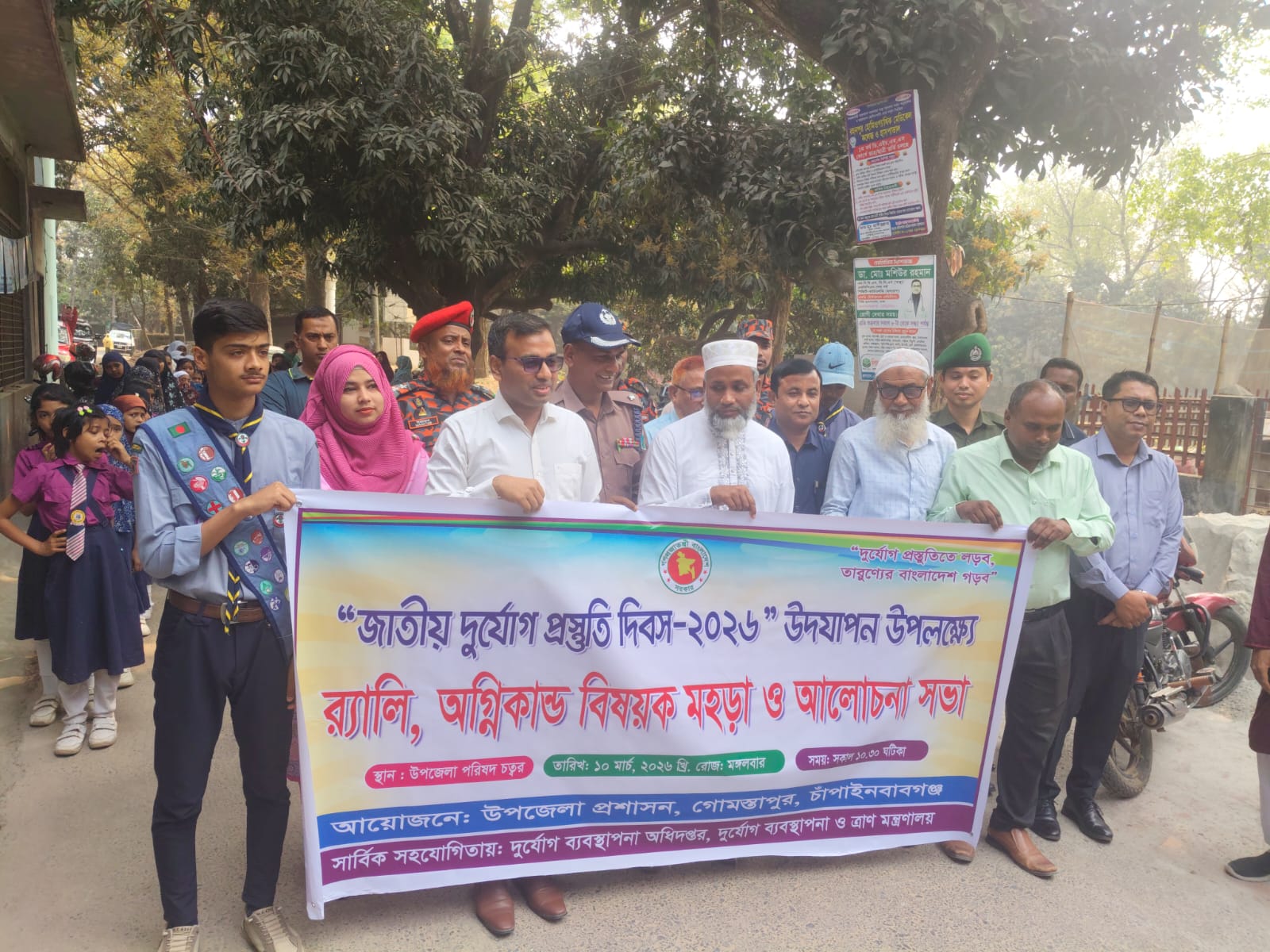 চাঁপাইনবাবগঞ্জের গোমস্তাপুর উপজেলায় আজ (১০ মার্চ, মঙ্গলবার) ফায়ার ব্রিগেডিং দিবস পালিত হয়েছে। সকাল ১০টায় উপজেলা চত্বর থেকে র্যালি শুরু হয়ে রহনপুরের বিভিন্ন স্থানে পদক্ষেপ করে সচেতনতা কার্যক্রম পরিচালনা করা হয়। র্যালিতে বিভিন্ন স্কুল ও কলেজের শিক্ষক ও ছাত্র-ছাত্রীবৃন্দও অংশ নেন। র্যালির পরে উপজেলা স্বাস্থ্য কমপ্লেক্সে আলোচনা সভা অনুষ্ঠিত হয়। অনুষ্ঠানটি উপজেলা প্রশাসনের আয়োজনে অনুষ্ঠিত হয়। র্যালি শুরু করেন উপজেলা নির্বাহী অফিসার জাকির মুন্সি। প্রধান অতিথি হিসেবে উপস্থিত ছিলেন চাঁপাইনবাবগঞ্জ-২ আসনের নবনির্বাচিত সংসদ সদস্য ডা. মিজানুর রহমান। বিশেষ অতিথি হিসেবে উপস্থিত ছিলেন উম্মে সালমা রুমি, সরকারি কমিশনার ভূমি। এছাড়াও উপস্থিত ছিলেন গোমস্তাপুর থানার অফিসার ইনচার্জ (ওসি) আব্দুল বারিক, ফায়ার সার্ভিস স্টেশন গোমস্তাপুরের স্টেশন অফিসার ইনচার্জ মোহাম্মদ মাহতাব উদ্দিন, উপজেলা আনসার ভিডিপির প্রধান ফরহাদ হোসেন, উপজেলা কর্মকর্তাবৃন্দ, সাংবাদিক, সুশীল সমাজ ও রাজনৈতিক নেতৃবৃন্দ। বিশেষভাবে উল্লেখযোগ্য, বিভিন্ন গোয়েন্দা সংস্থার কর্মকর্তাবৃন্দও উপস্থিত ছিলেন। প্রধান অতিথি ডা. মিজানুর রহমান তার বক্তব্যে বলেন, "ফায়ার ব্রিগেডিং দিবসের মাধ্যমে সাধারণ মানুষকে আগুন প্রতিরোধ ও নিরাপদ থাকার উপায় সম্পর্কে সচেতন করা যায়। ফায়ার সার্ভিসের আধুনিকায়ন এবং প্রশিক্ষণের মাধ্যমে স্থানীয় জনগণের সুরক্ষা আরও নিশ্চিত করা হবে। আমরা সকলে একসাথে কাজ করে জরুরি প্রতিক্রিয়ার মান উন্নয়ন নিশ্চিত করতে পারি। ফায়ার সার্ভিস স্টেশনের স্টেশন অফিসার ইনচার্জ মোহাম্মদ মাহতাব উদ্দিন বলেন, "ফায়ার ব্রিগেডিং দিবসের মূল উদ্দেশ্য জনসচেতনতা বৃদ্ধি এবং আগুনে সুরক্ষা নিশ্চিত করা। ফায়ার সার্ভিসের আধুনিক সরঞ্জাম ও প্রশিক্ষণের মাধ্যমে আমরা দ্রুত ও কার্যকরভাবে বিপর্যয় মোকাবিলা করতে সক্ষম হব।"